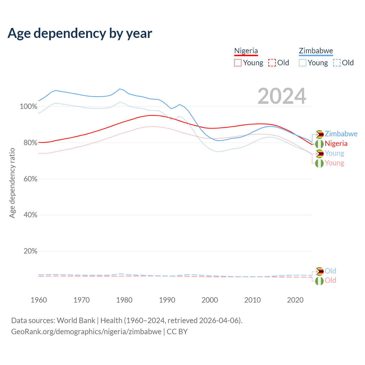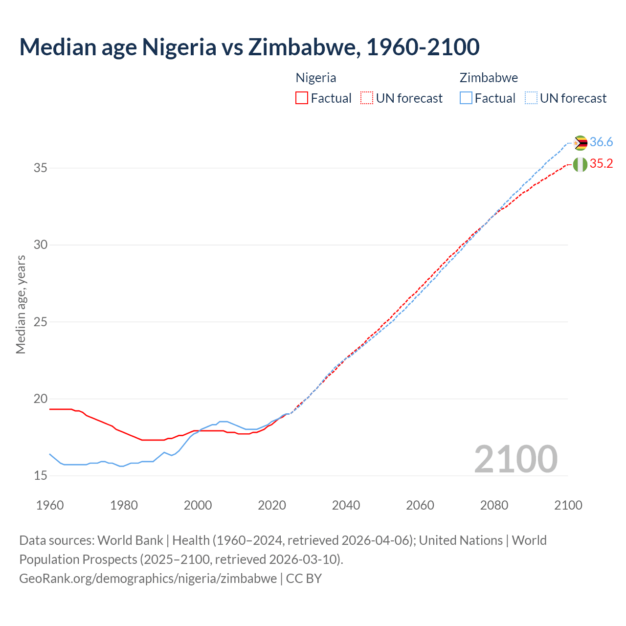 - Nigeria is ranked 178/196 by median age (oldest to youngest) vs 177/196 for Zimbabwe.