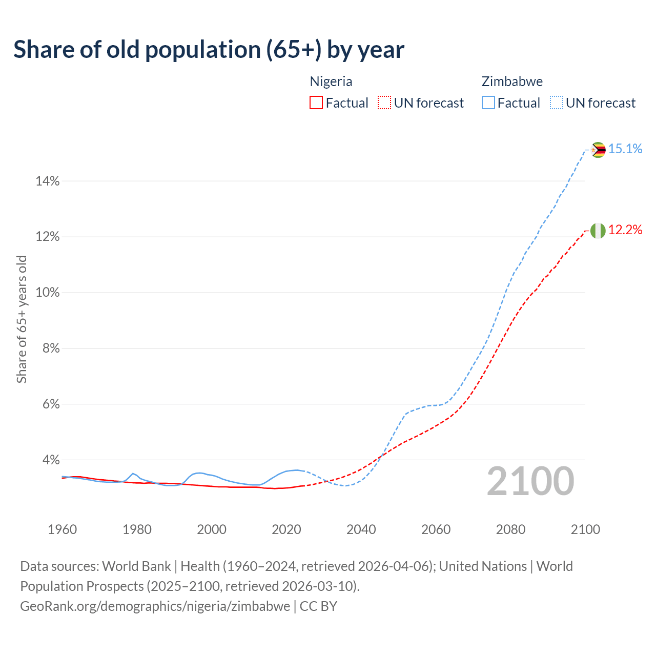 The share of older people aged 65 and over is 3.05% in Nigeria and 3.6% in Zimbabwe. Life expectancy in Nigeria compared to Zimbabwe .