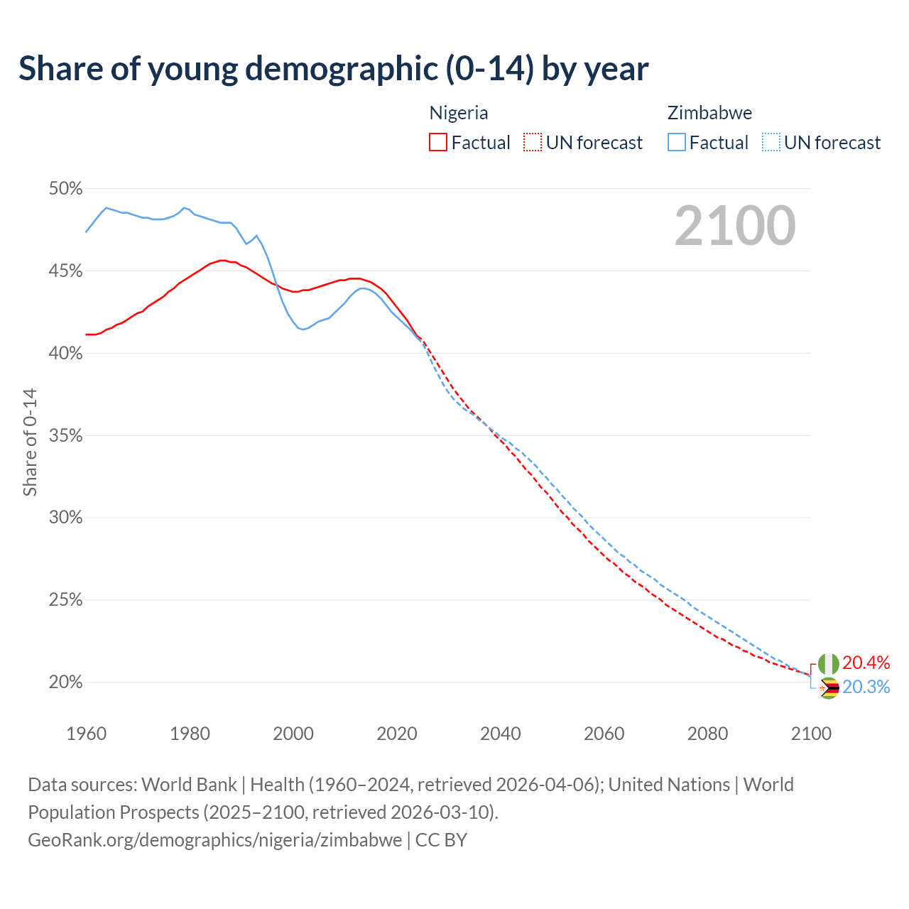 - The share of young demographic (0-15 years old) in Nigeria is 41% vs 40.9% in Zimbabwe.