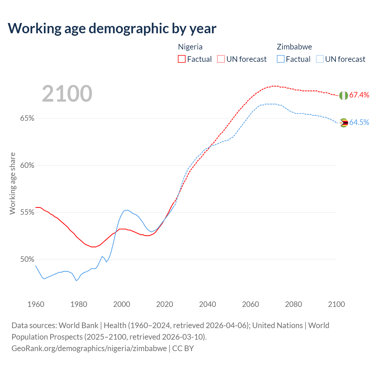 - Nigeria has 136M working age adults (aged 15-64) vs 9.64M in Zimbabwe.