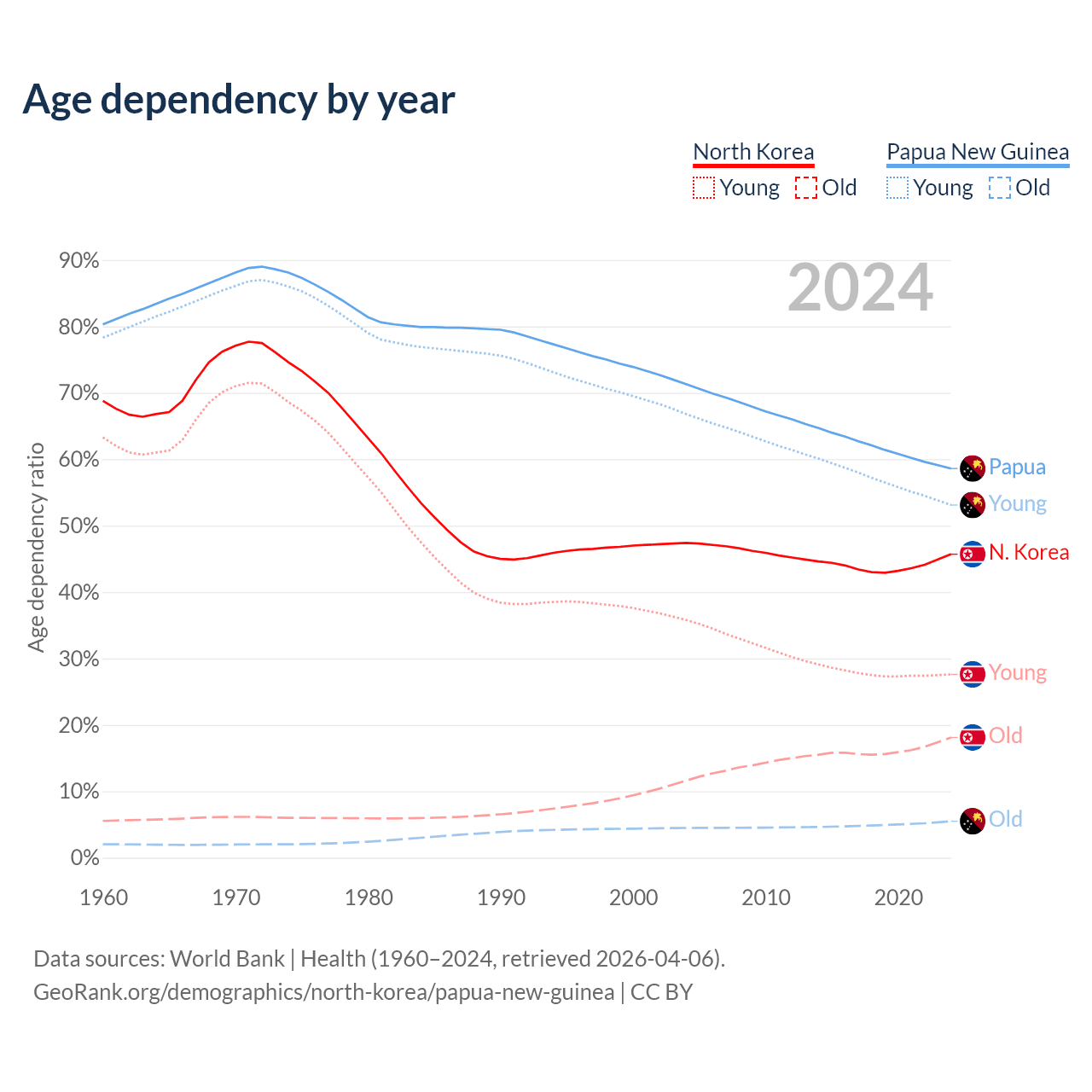 - North Korea is ranked 62/196 by median age (oldest to youngest) vs 140/196 for Papua New Guinea.