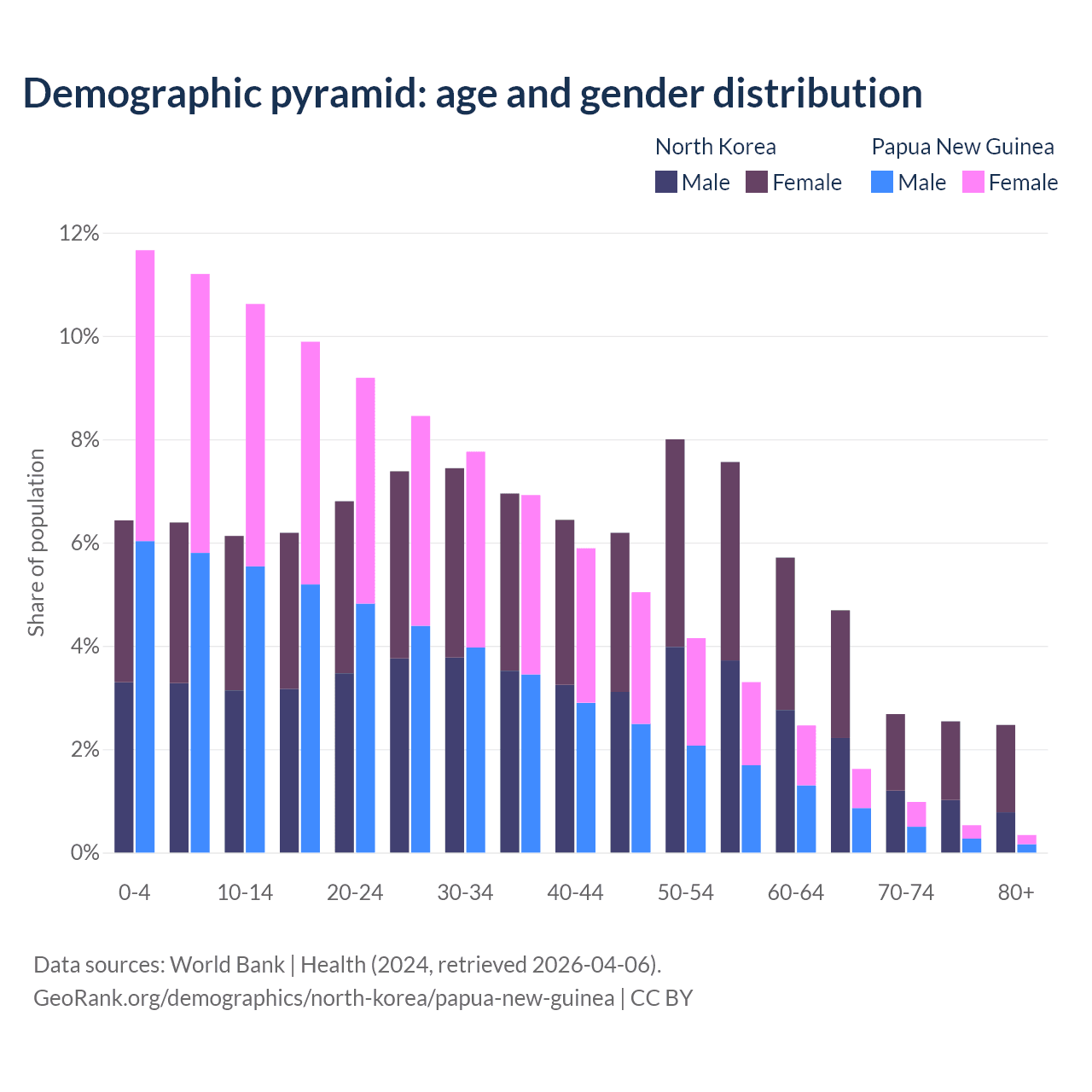 - As of 2026, the population of North Korea is 26.7M vs 11M in Papua New Guinea - 2.42 times difference.