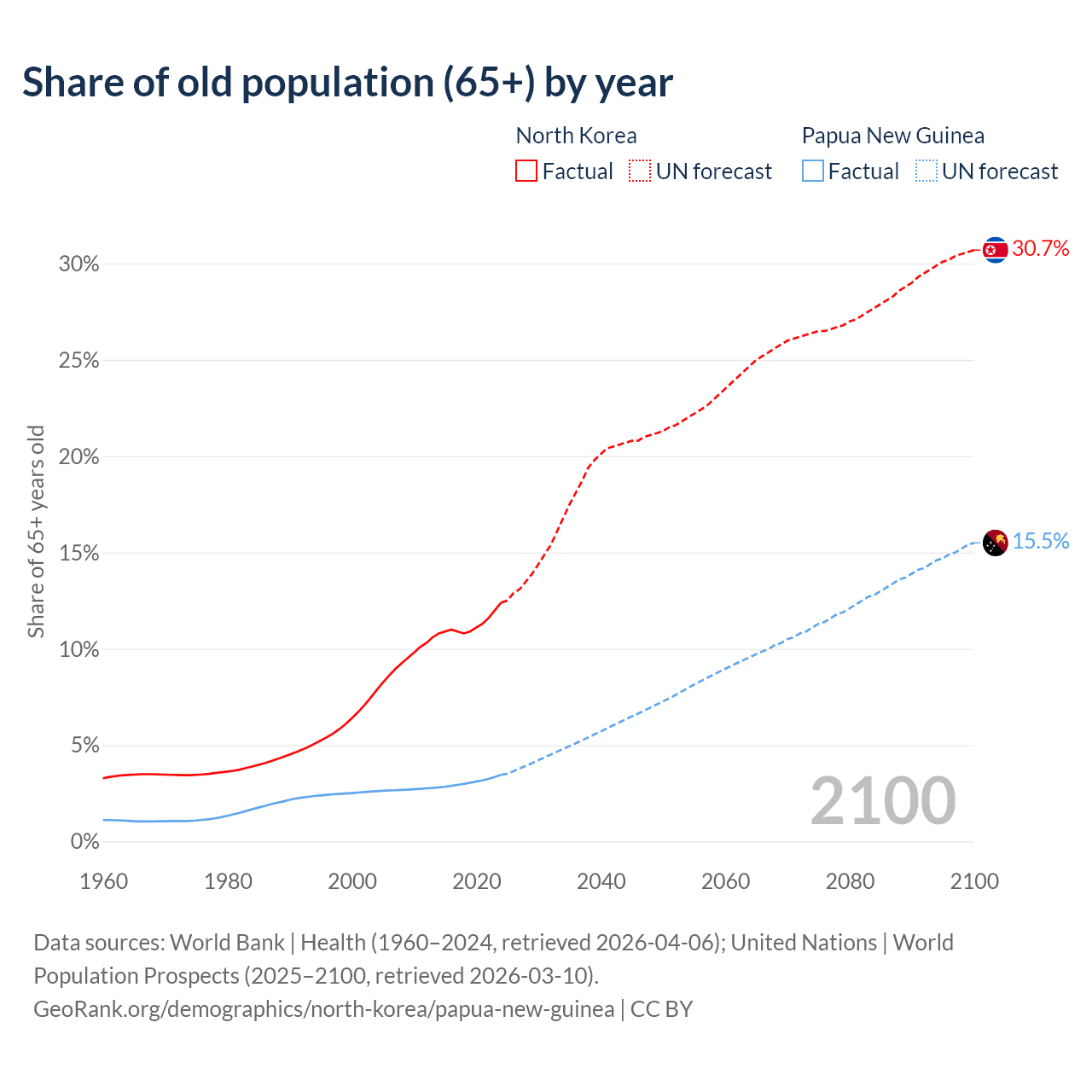 The share of older people aged 65 and over is 12.4% in North Korea and 3.46% in Papua New Guinea. Life expectancy in North Korea compared to Papua New Guinea .