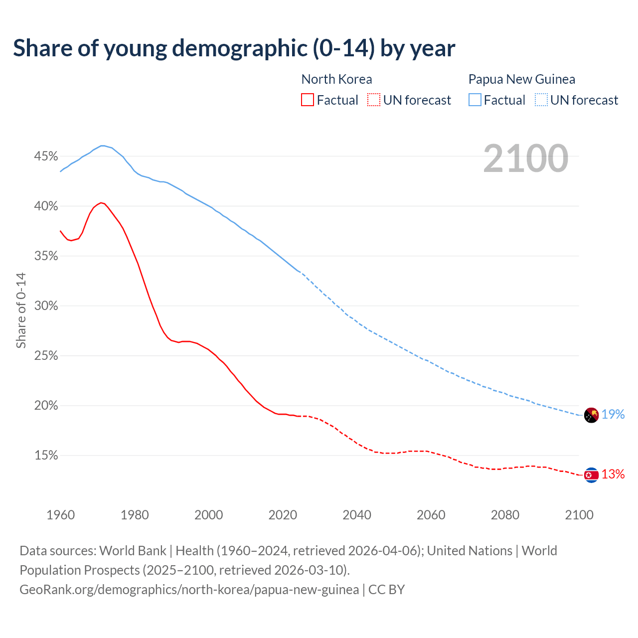 - The share of young demographic (0-15 years old) in North Korea is 18.9% vs 33.5% in Papua New Guinea.
