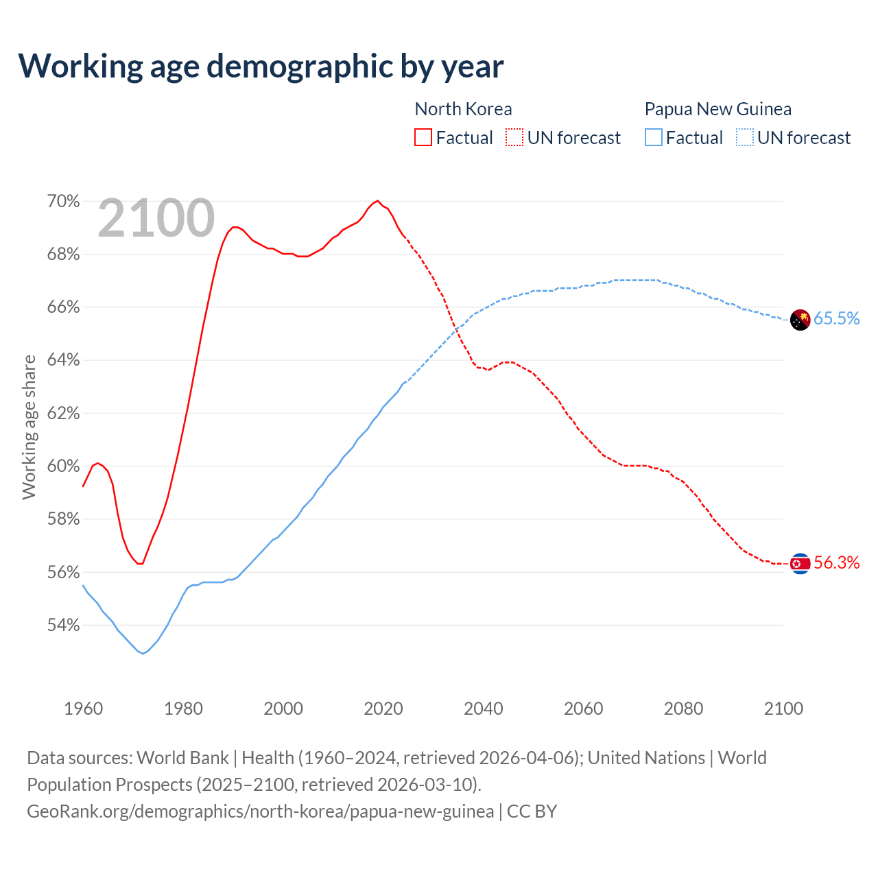- North Korea has 18.3M working age adults (aged 15-64) vs 6.94M in Papua New Guinea.