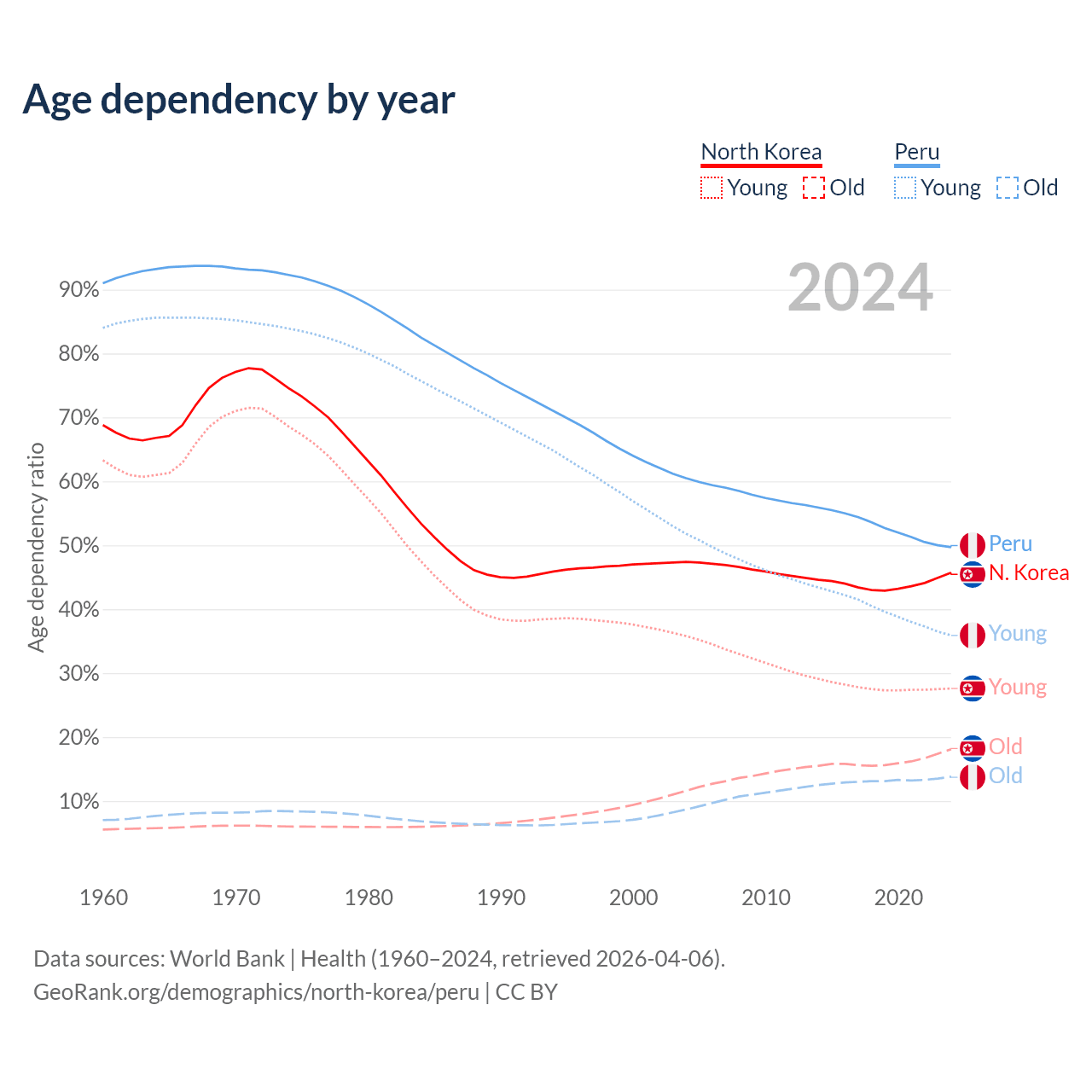 - North Korea is ranked 62/196 by median age (oldest to youngest) vs 97/196 for Peru.