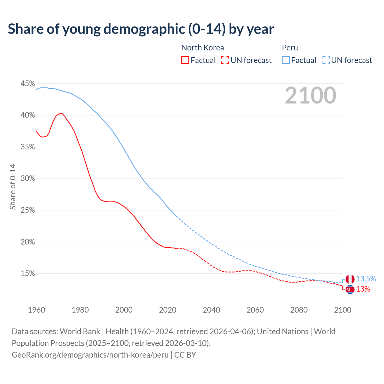 - The share of young demographic (0-15 years old) in North Korea is 18.9% vs 24% in Peru.