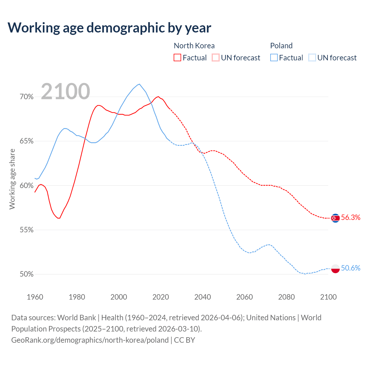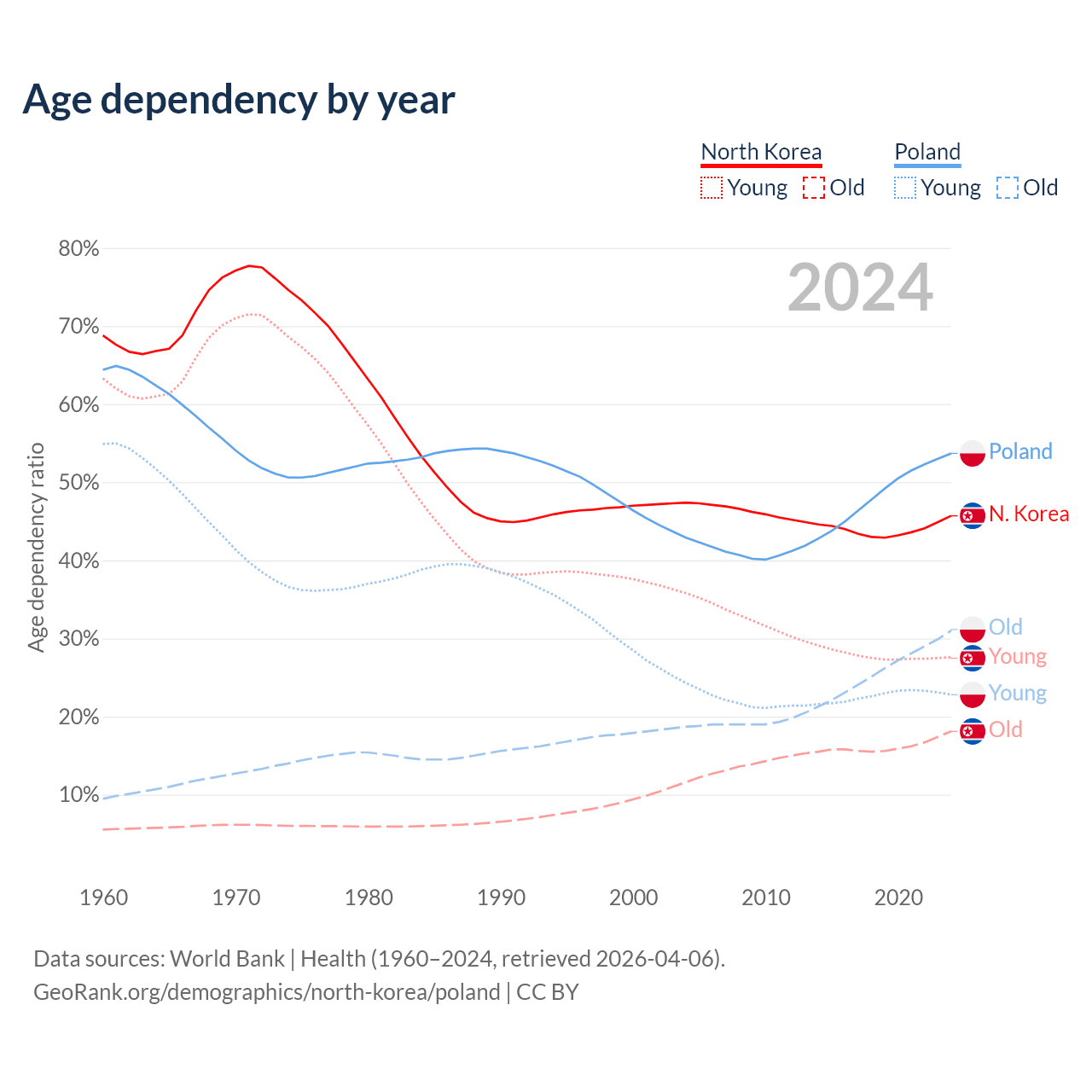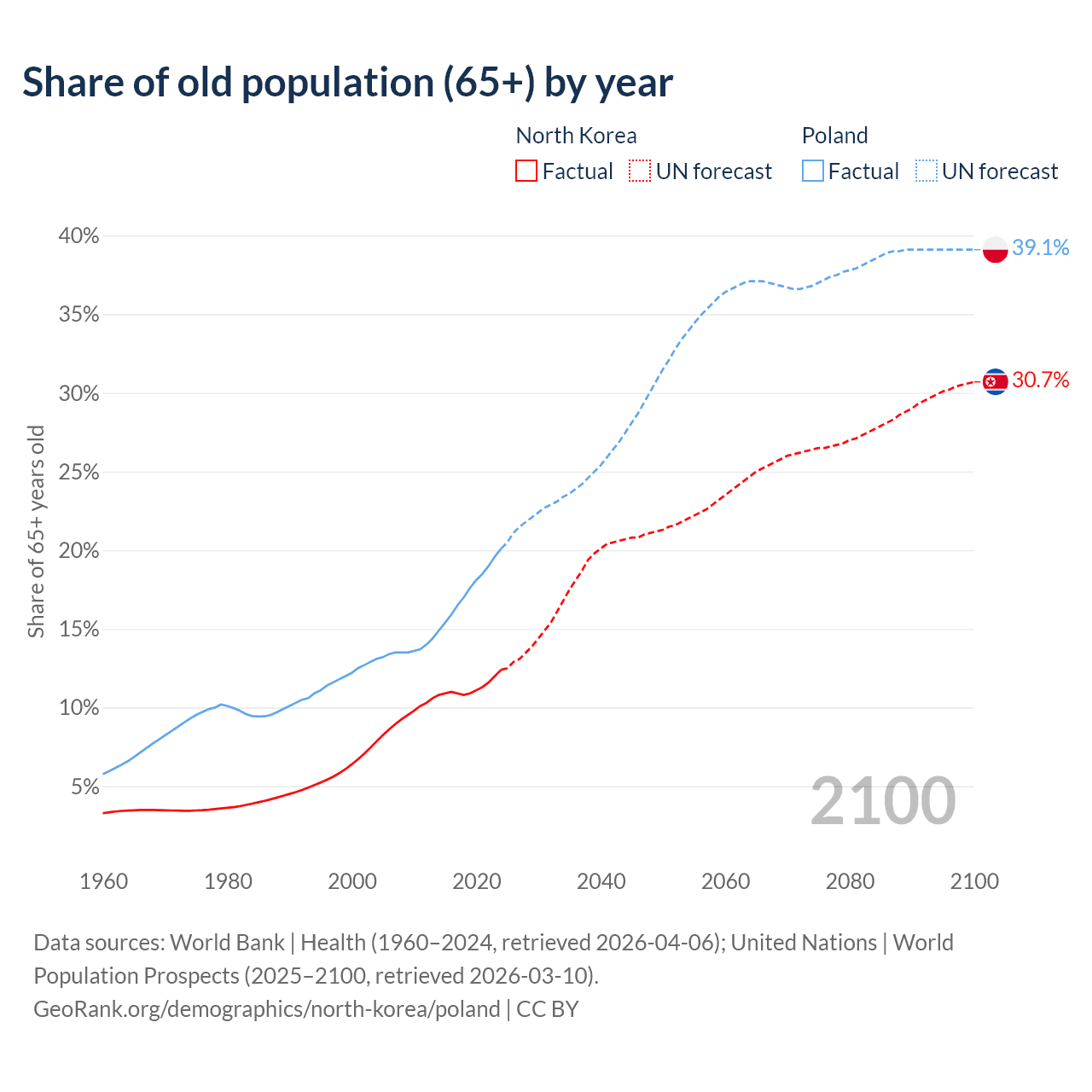 The share of older people aged 65 and over is 12.4% in North Korea and 20.1% in Poland. Life expectancy in North Korea compared to Poland .