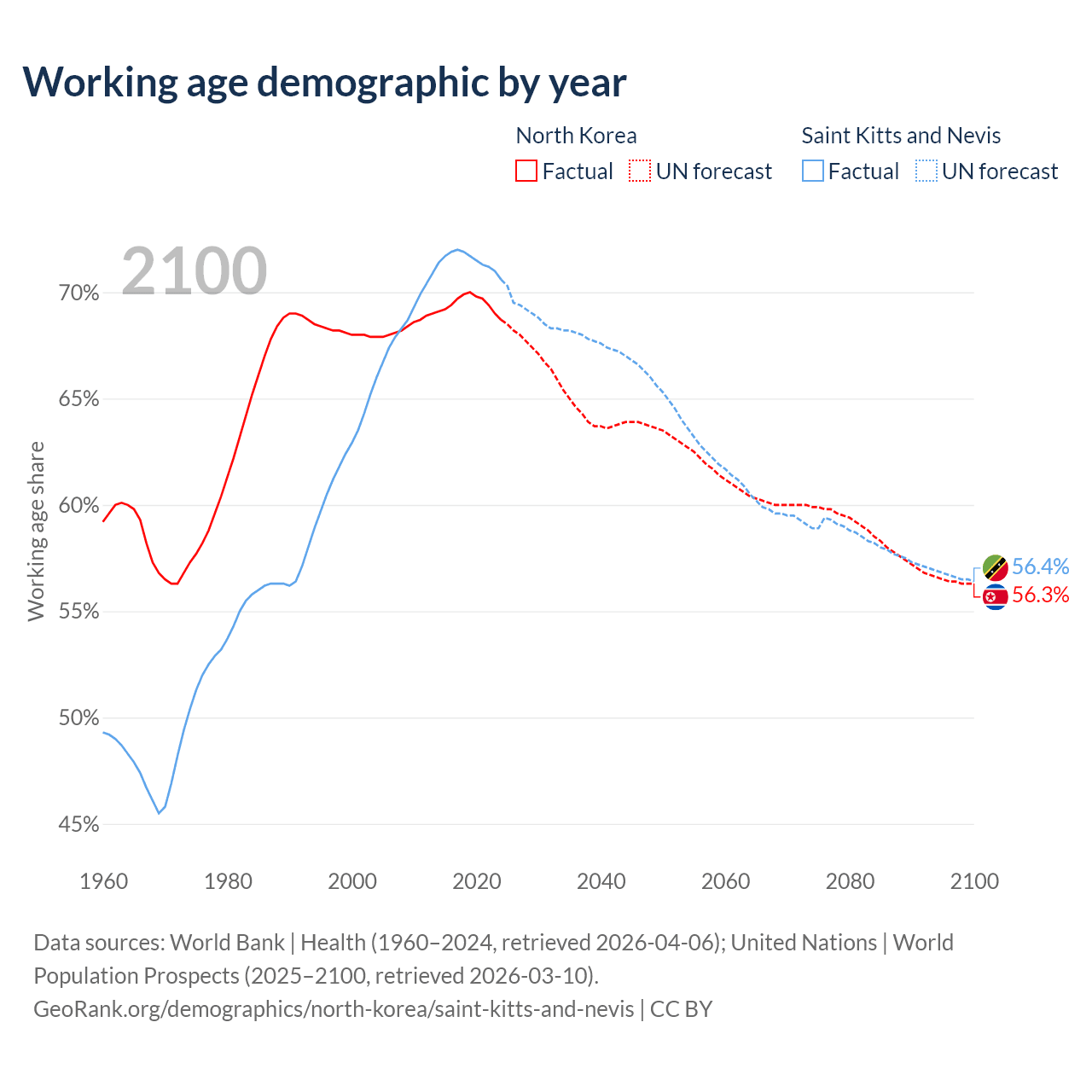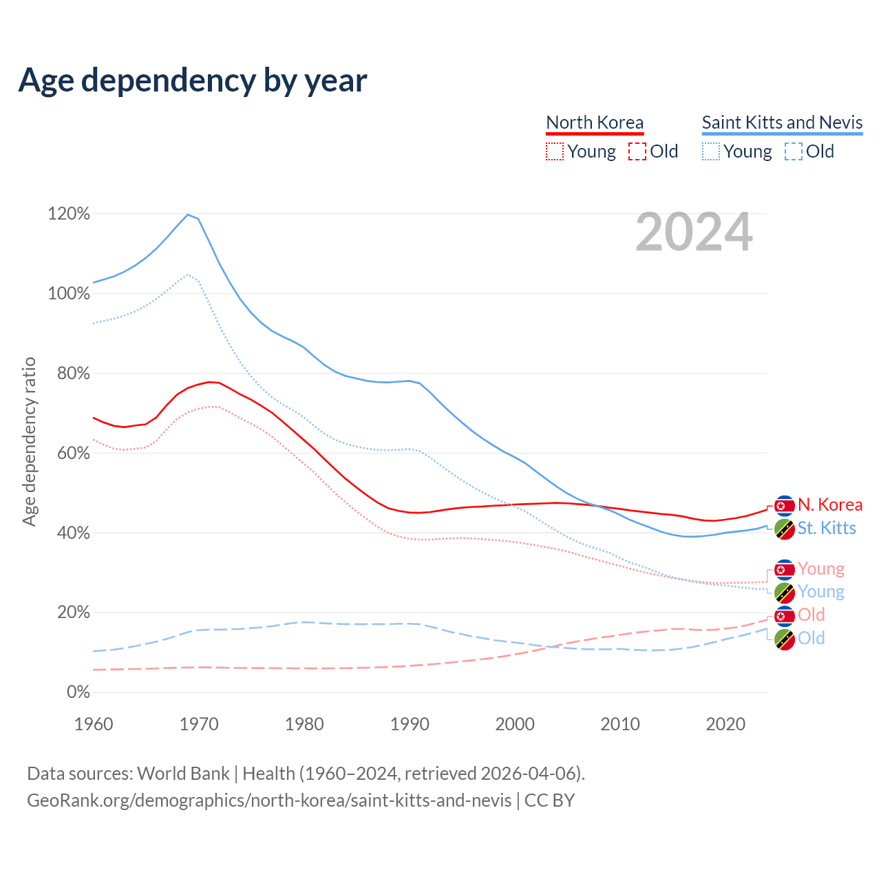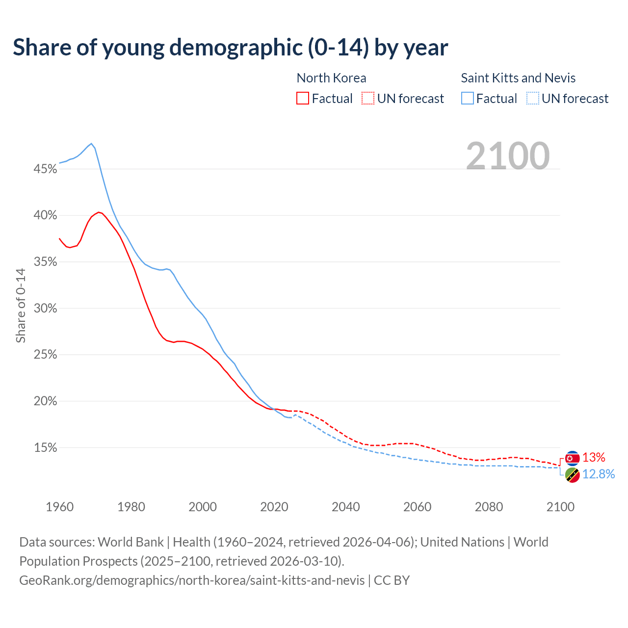 - The share of young demographic (0-15 years old) in North Korea is 18.9% vs 18.2% in Saint Kitts and Nevis.
