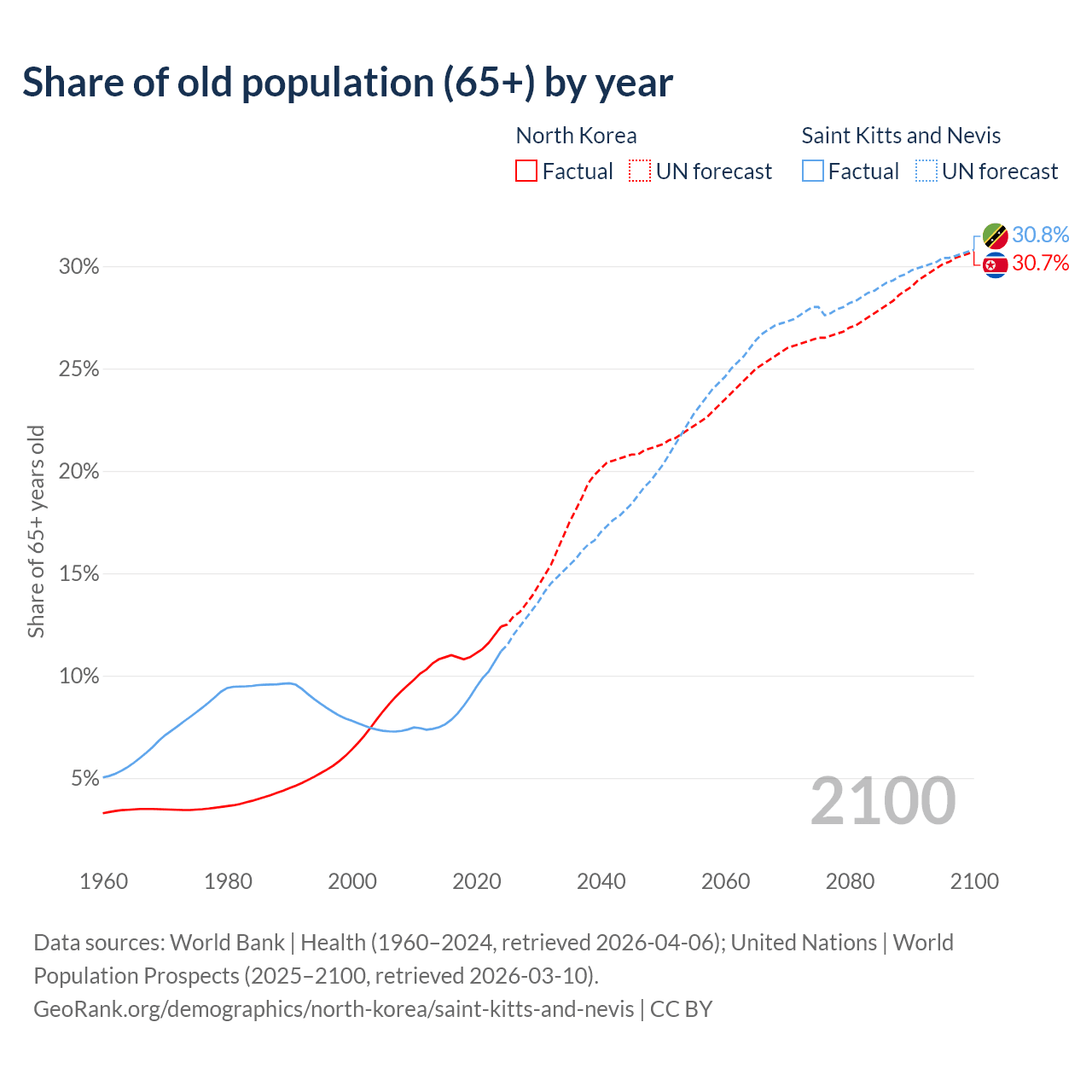 The share of older people aged 65 and over is 12.4% in North Korea and 11.2% in Saint Kitts and Nevis. Life expectancy in North Korea compared to Saint Kitts and Nevis .