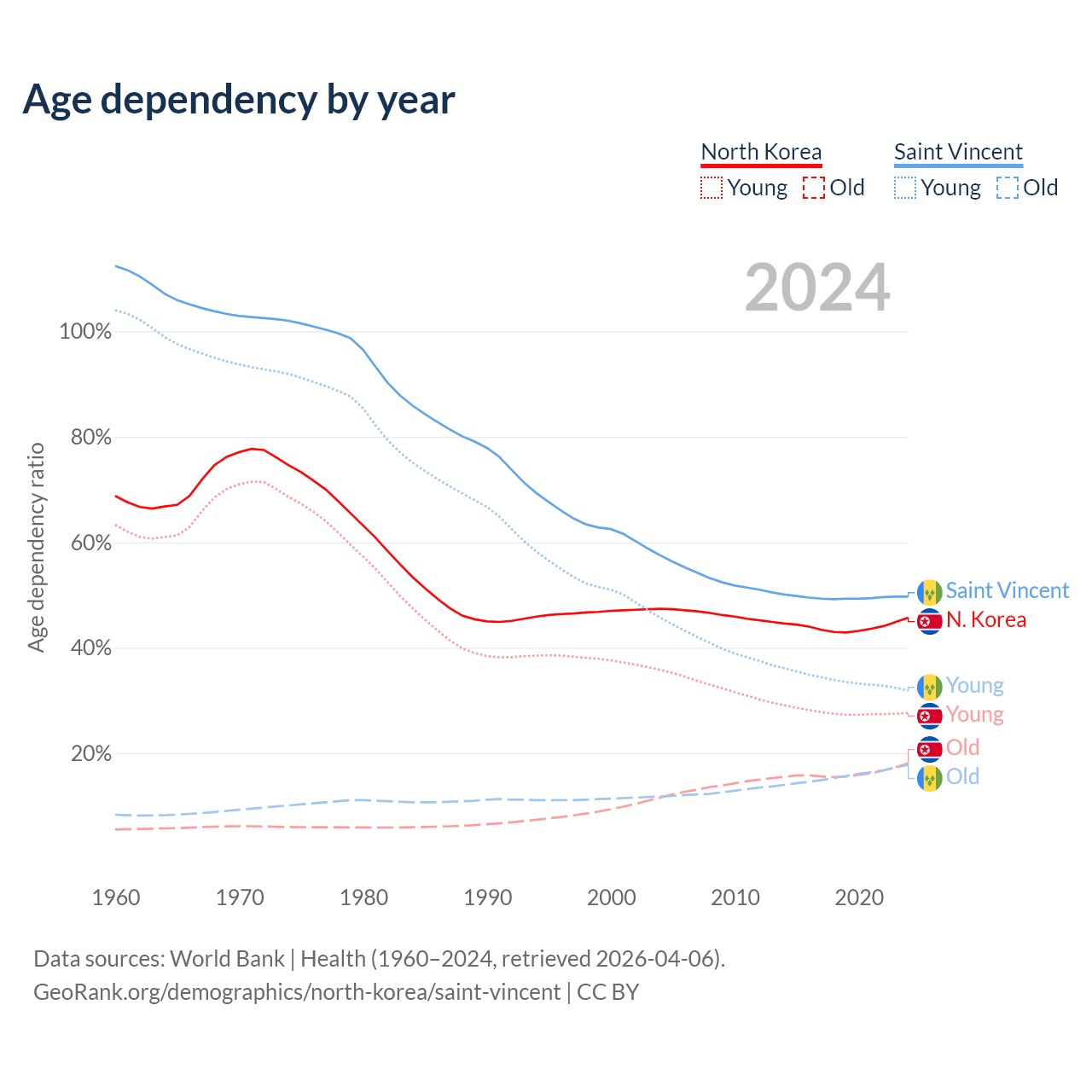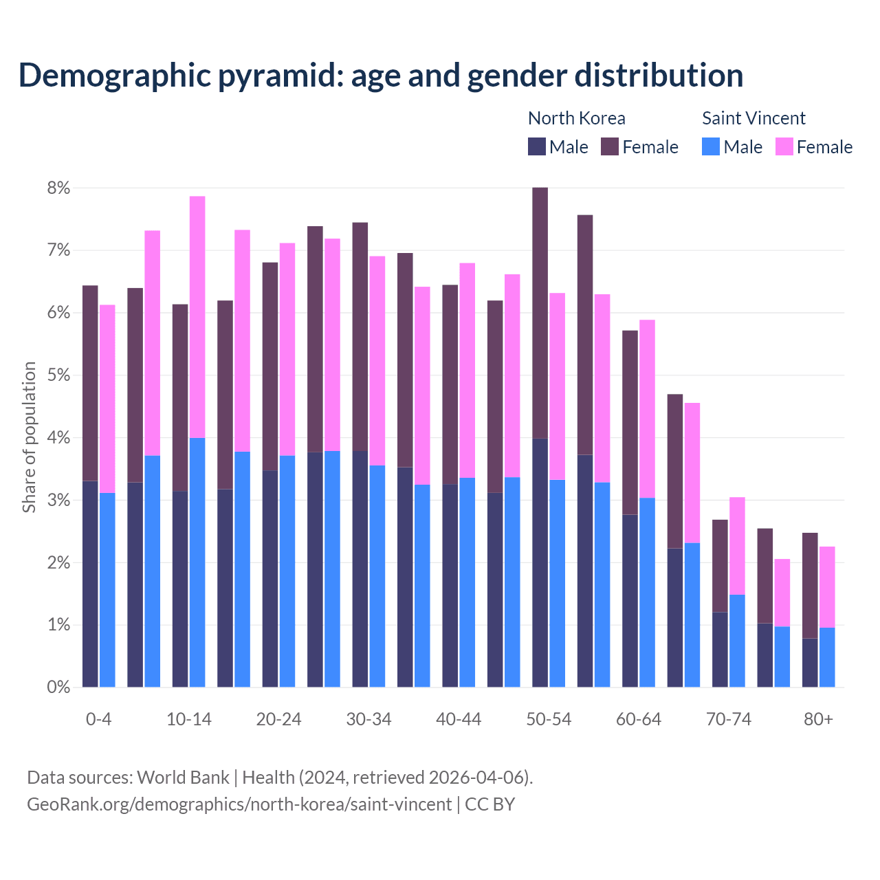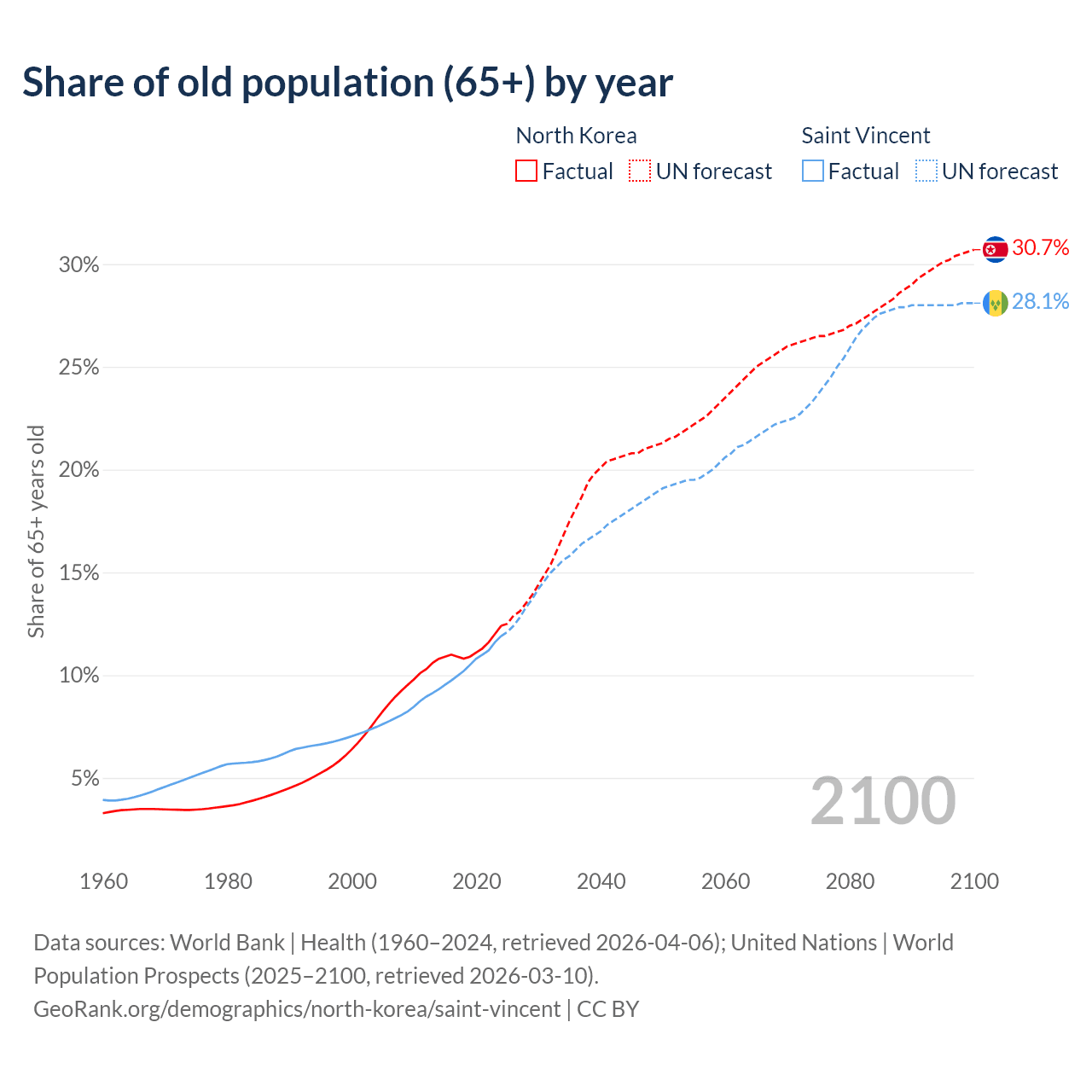 - The share of old-age demographic (65+) in North Korea is 12.4% vs 11.9% in Saint Vincent.