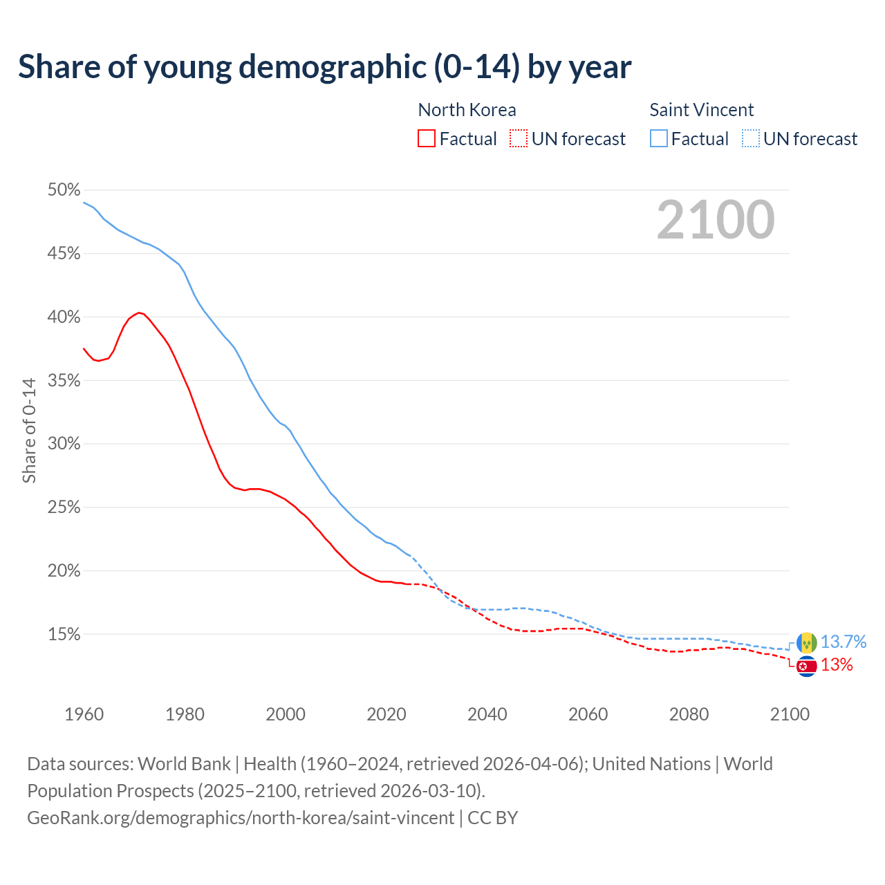 - The share of young demographic (0-15 years old) in North Korea is 18.9% vs 21.3% in Saint Vincent.