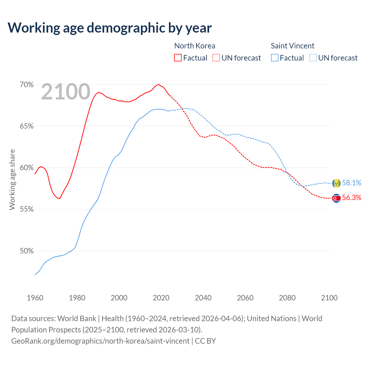 - North Korea has 18.3M working age adults (aged 15-64) vs 66.3K in Saint Vincent.