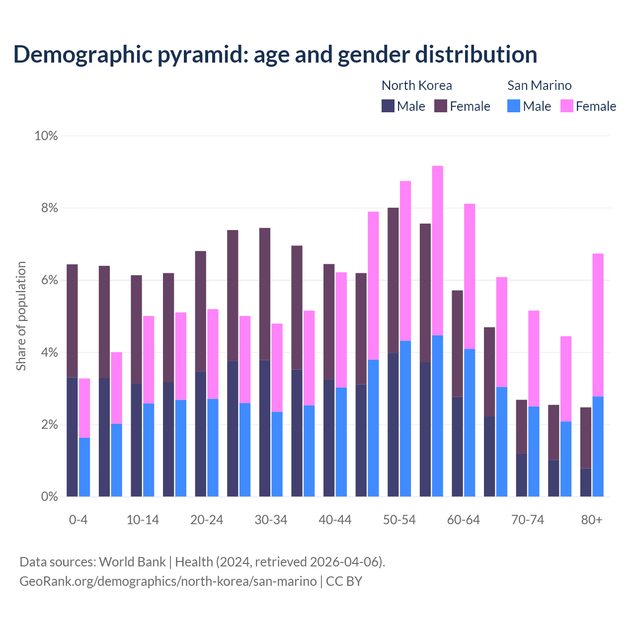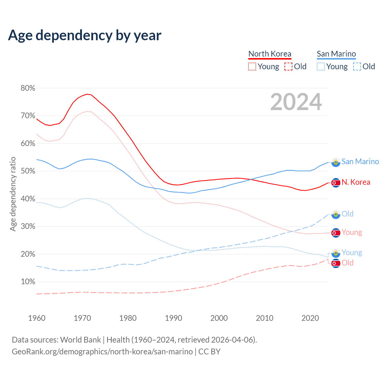 - The share of old-age demographic (65+) in North Korea is 12.4% vs 22.4% in San Marino.