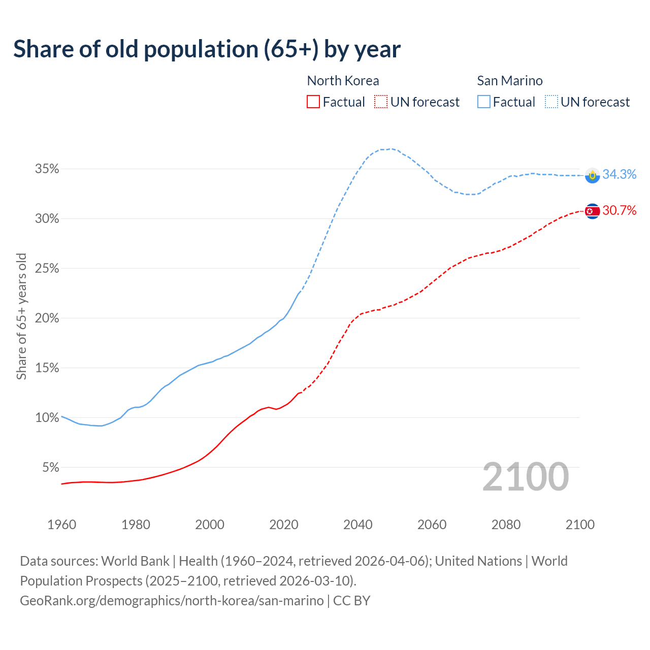 The share of older people aged 65 and over is 12.4% in North Korea and 22.4% in San Marino. Life expectancy in North Korea compared to San Marino .