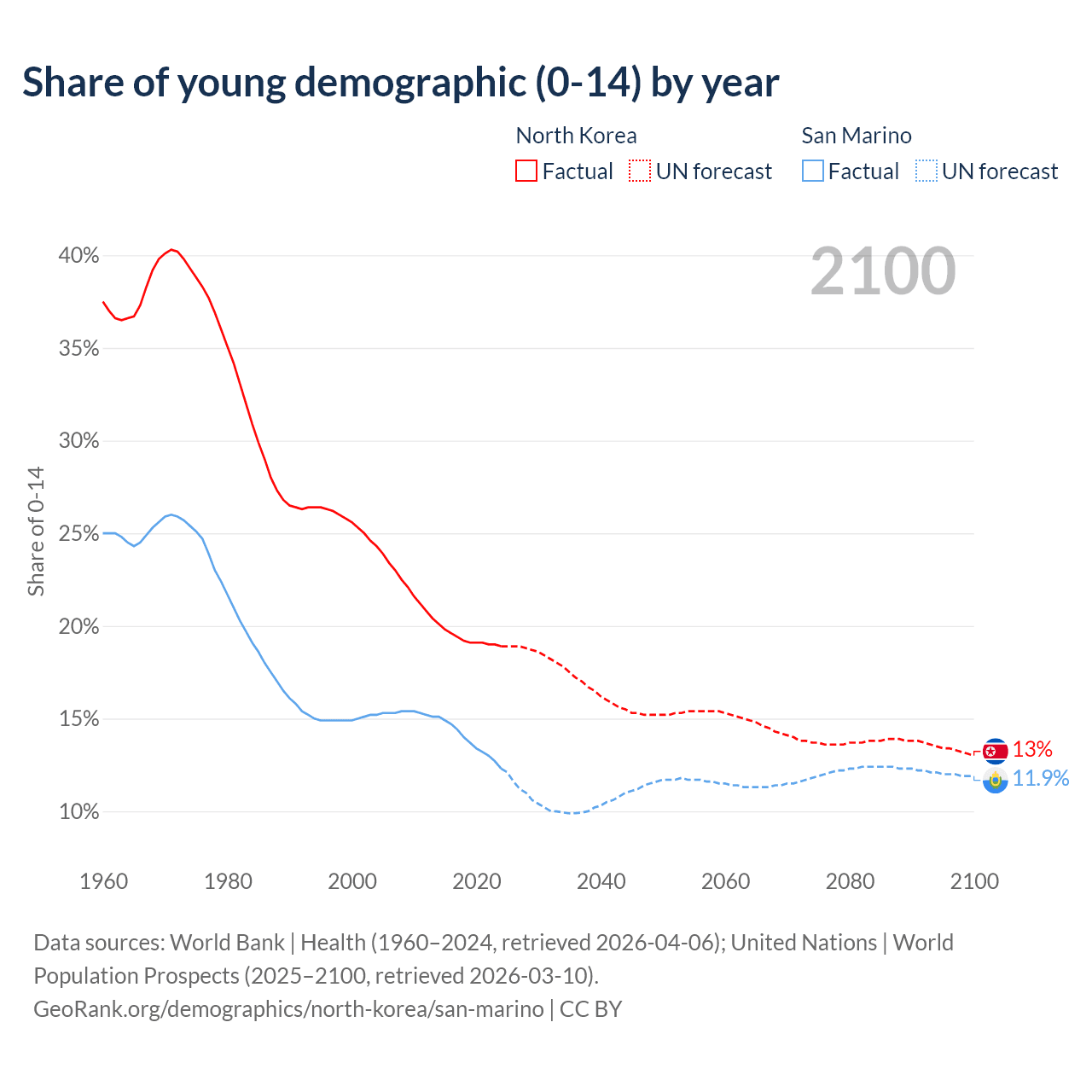 - The share of young demographic (0-15 years old) in North Korea is 18.9% vs 12.3% in San Marino.