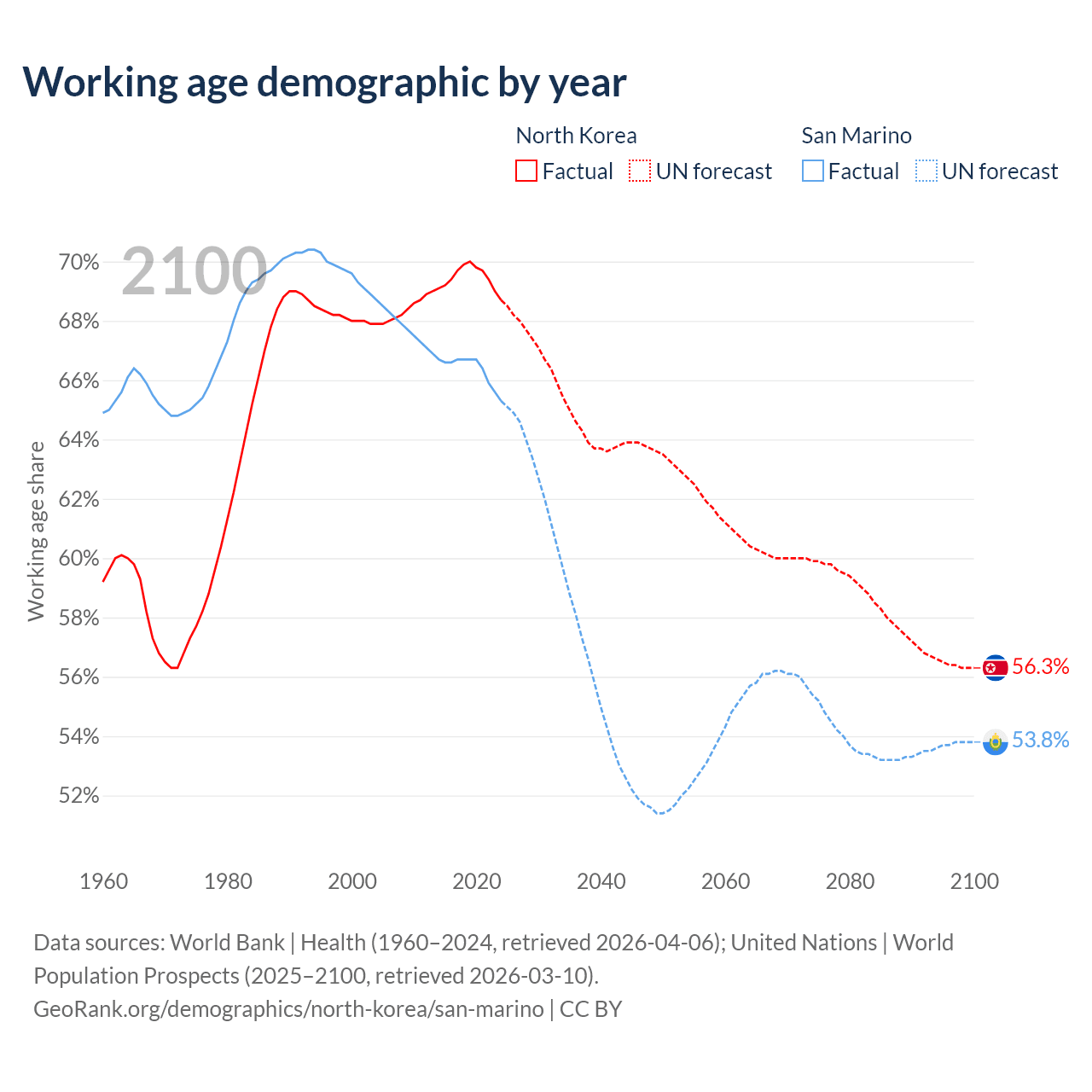 - North Korea has 18.3M working age adults (aged 15-64) vs 22.2K in San Marino.