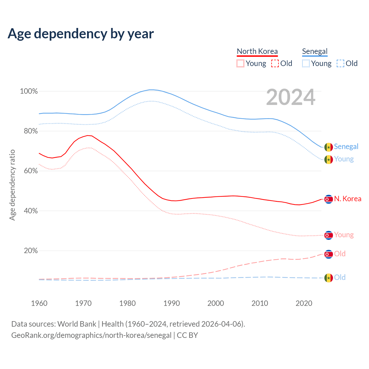- The share of old-age demographic (65+) in North Korea is 12.4% vs 3.62% in Senegal.