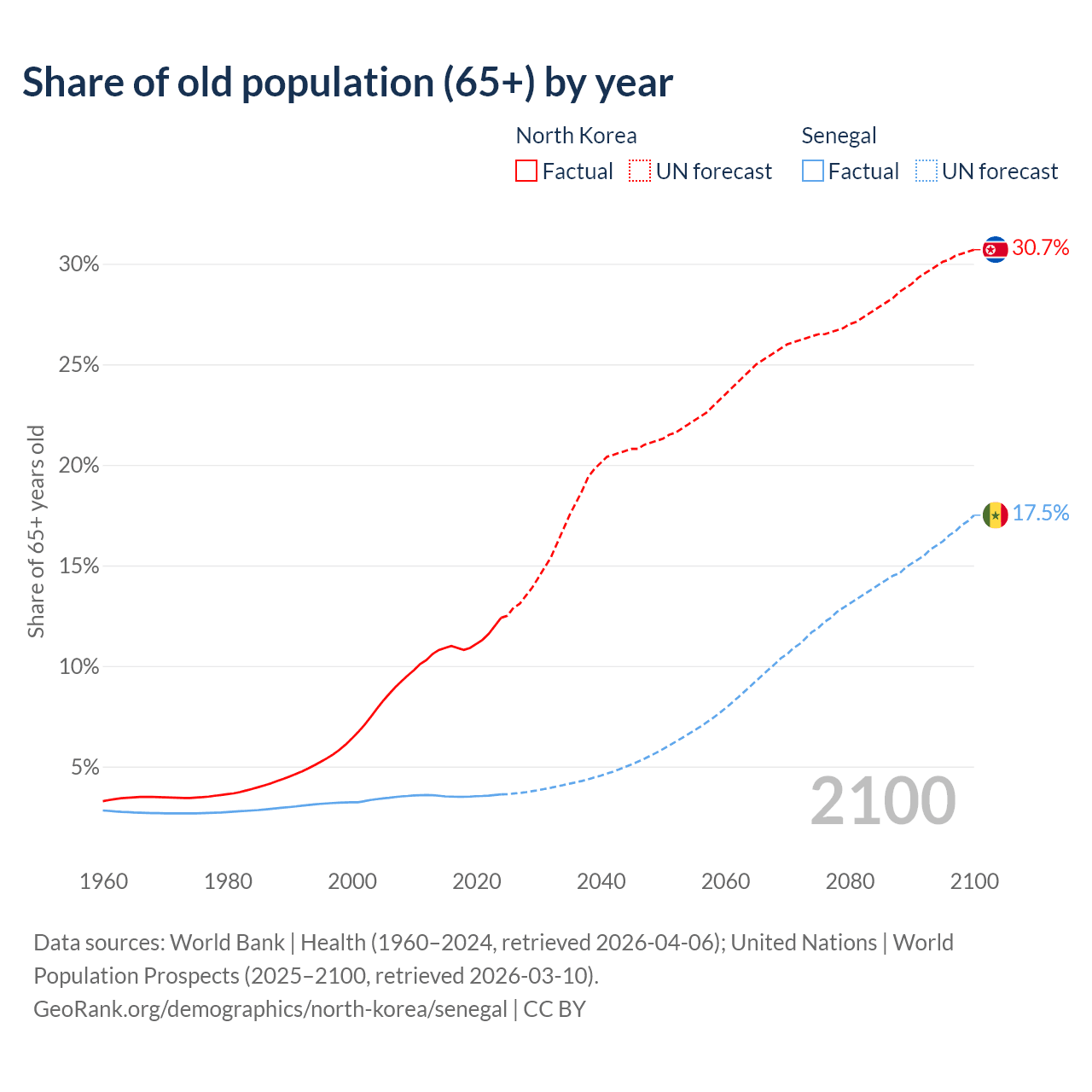 The share of older people aged 65 and over is 12.4% in North Korea and 3.62% in Senegal. Life expectancy in North Korea compared to Senegal .