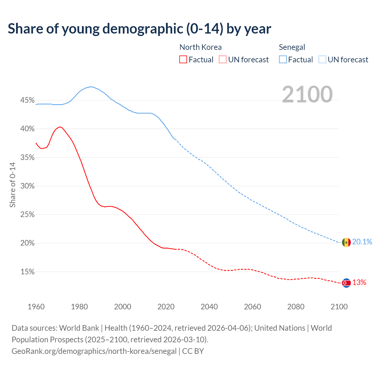 - The share of young demographic (0-15 years old) in North Korea is 18.9% vs 38.2% in Senegal.