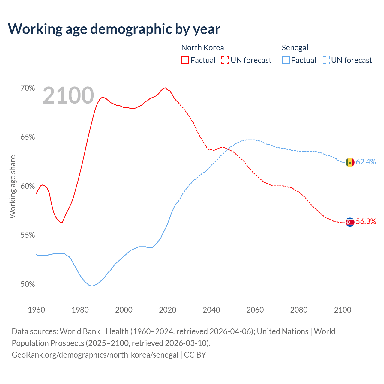 - North Korea has 18.3M working age adults (aged 15-64) vs 11.3M in Senegal.