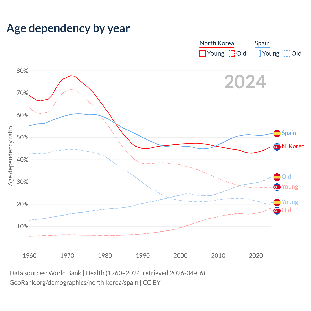 - North Korea is ranked 62/196 by median age (oldest to youngest) vs 7/196 for Spain.
