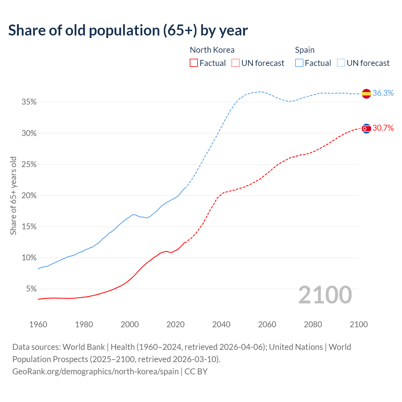 The share of older people aged 65 and over is 12.4% in North Korea and 21.1% in Spain. Life expectancy in North Korea compared to Spain .