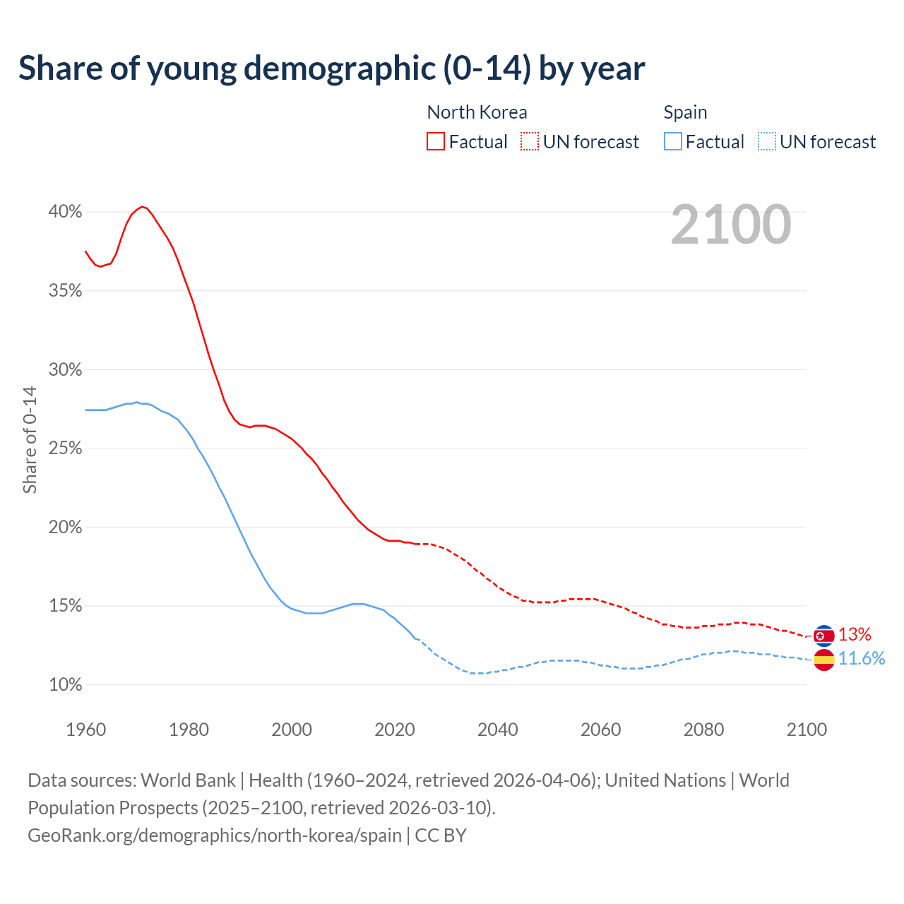 - The share of young demographic (0-15 years old) in North Korea is 18.9% vs 12.9% in Spain.