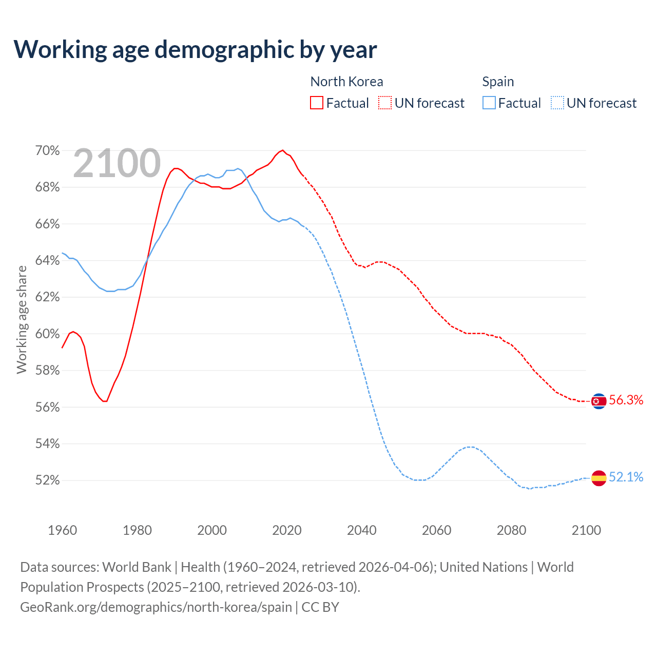 - North Korea has 18.3M working age adults (aged 15-64) vs 32.2M in Spain.