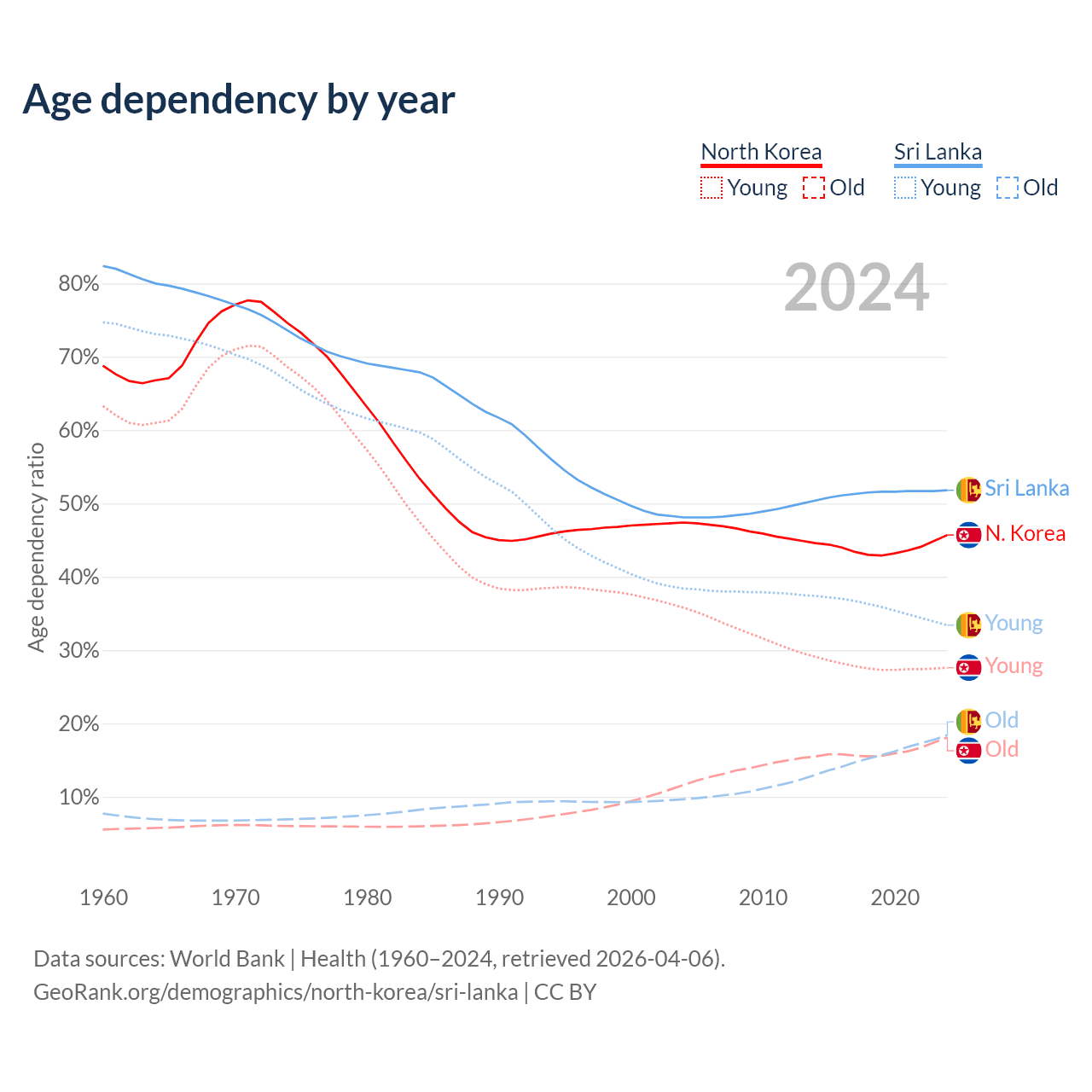 - North Korea is ranked 62/196 by median age (oldest to youngest) vs 81/196 for Sri Lanka.