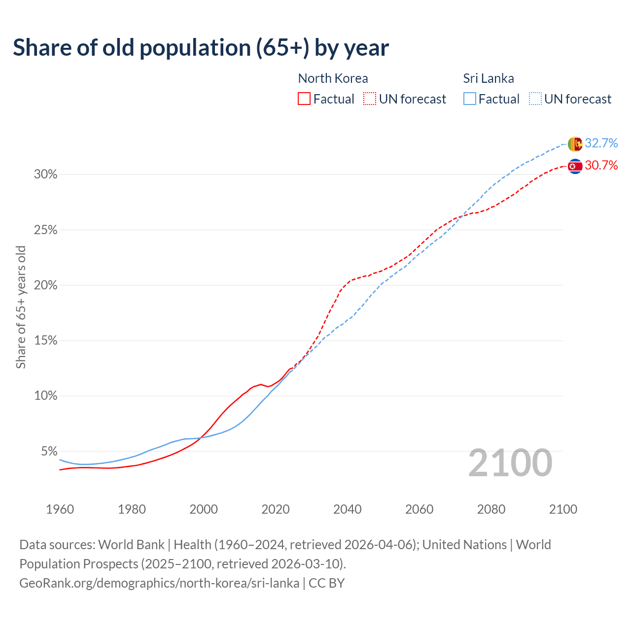 The share of older people aged 65 and over is 12.4% in North Korea and 12.1% in Sri Lanka. Life expectancy in North Korea compared to Sri Lanka .