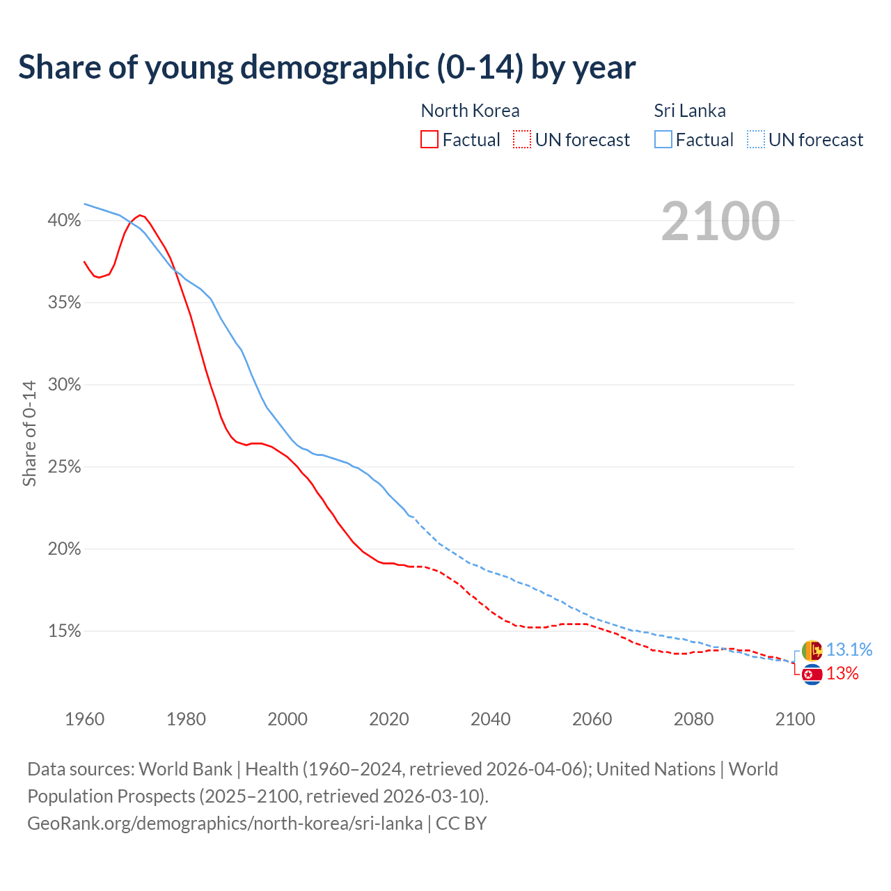 - The share of young demographic (0-15 years old) in North Korea is 18.9% vs 22% in Sri Lanka.