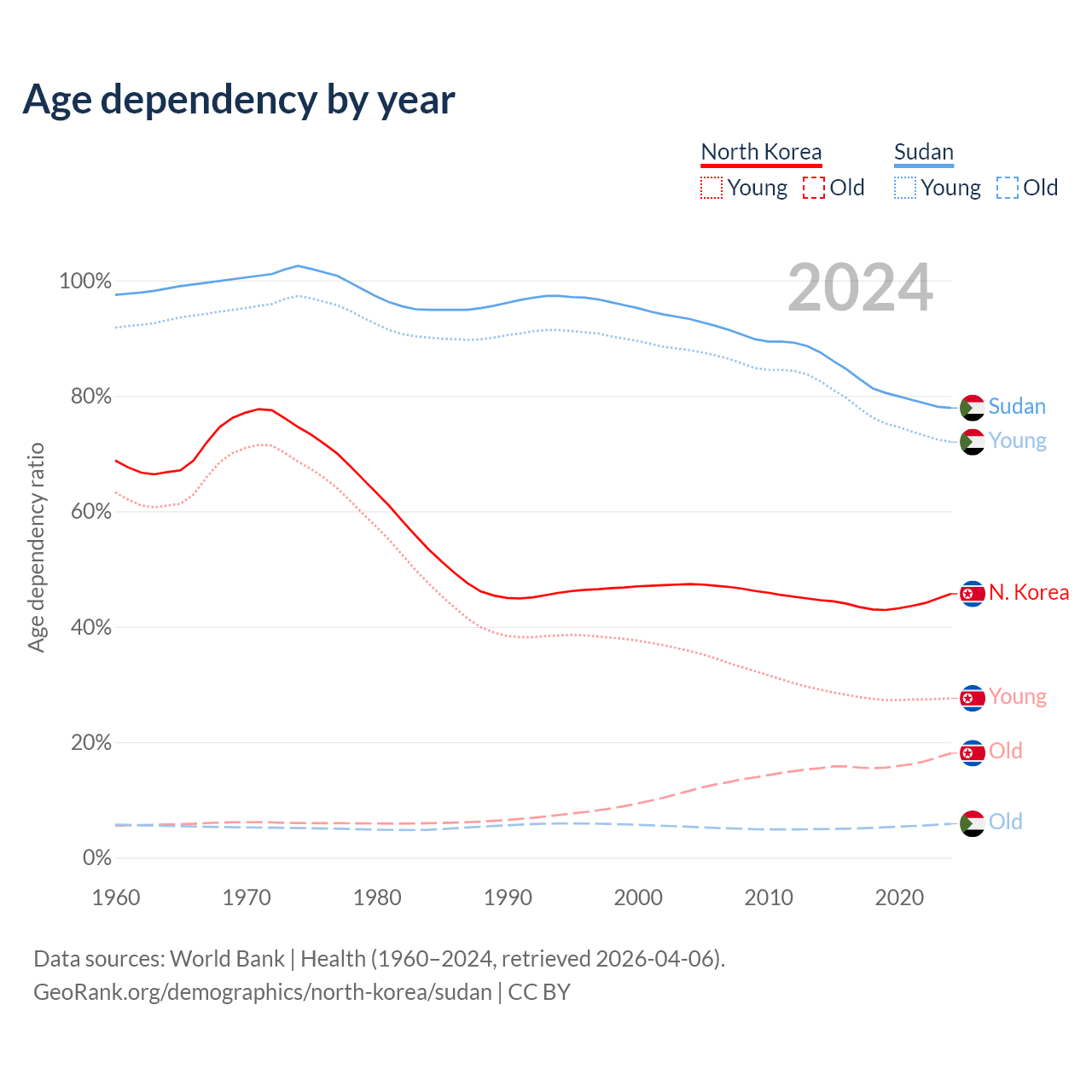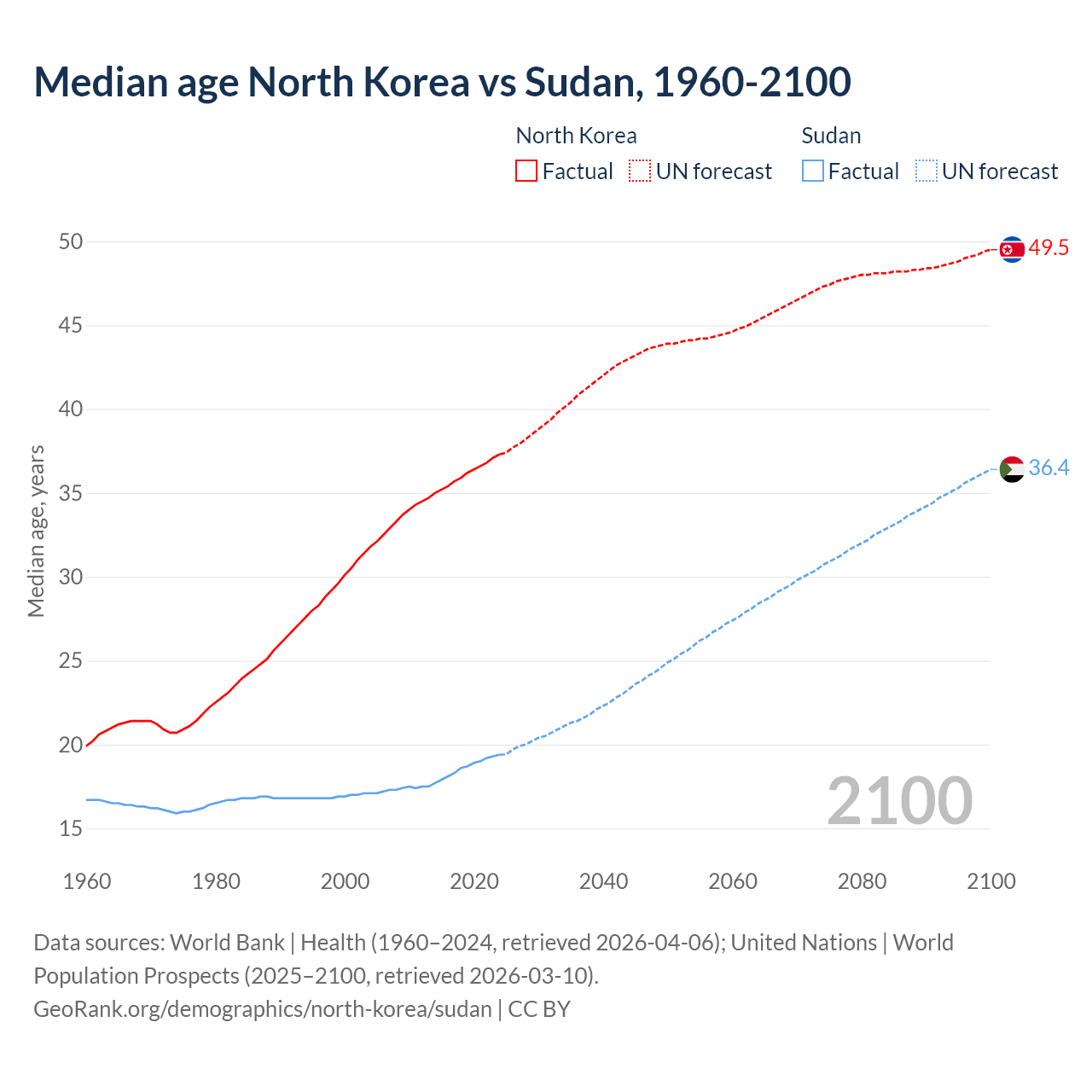 - North Korea is ranked 62/196 by median age (oldest to youngest) vs 172/196 for Sudan.
