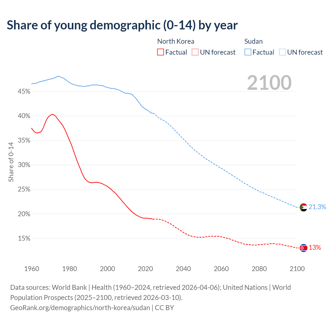 - The share of young demographic (0-15 years old) in North Korea is 18.9% vs 40.5% in Sudan.