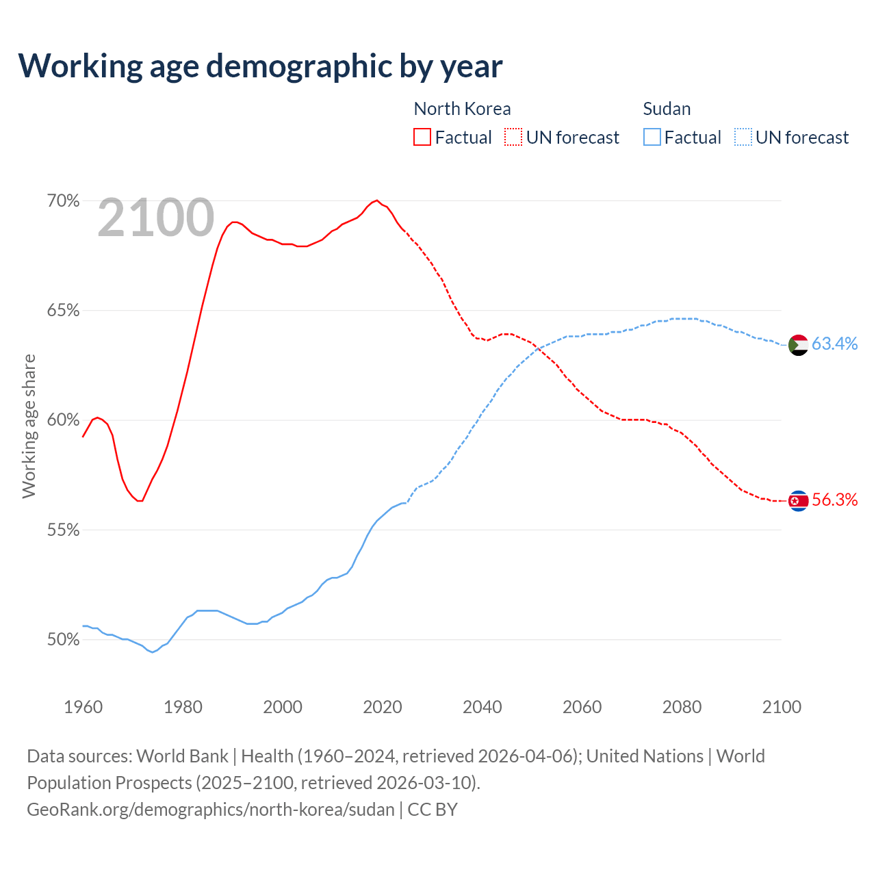 - North Korea has 18.3M working age adults (aged 15-64) vs 30M in Sudan.