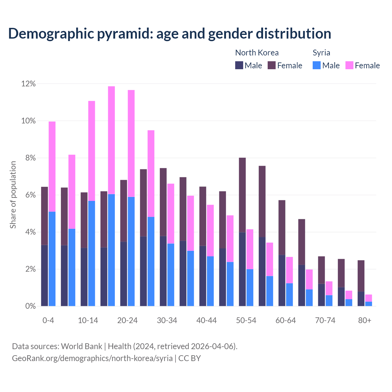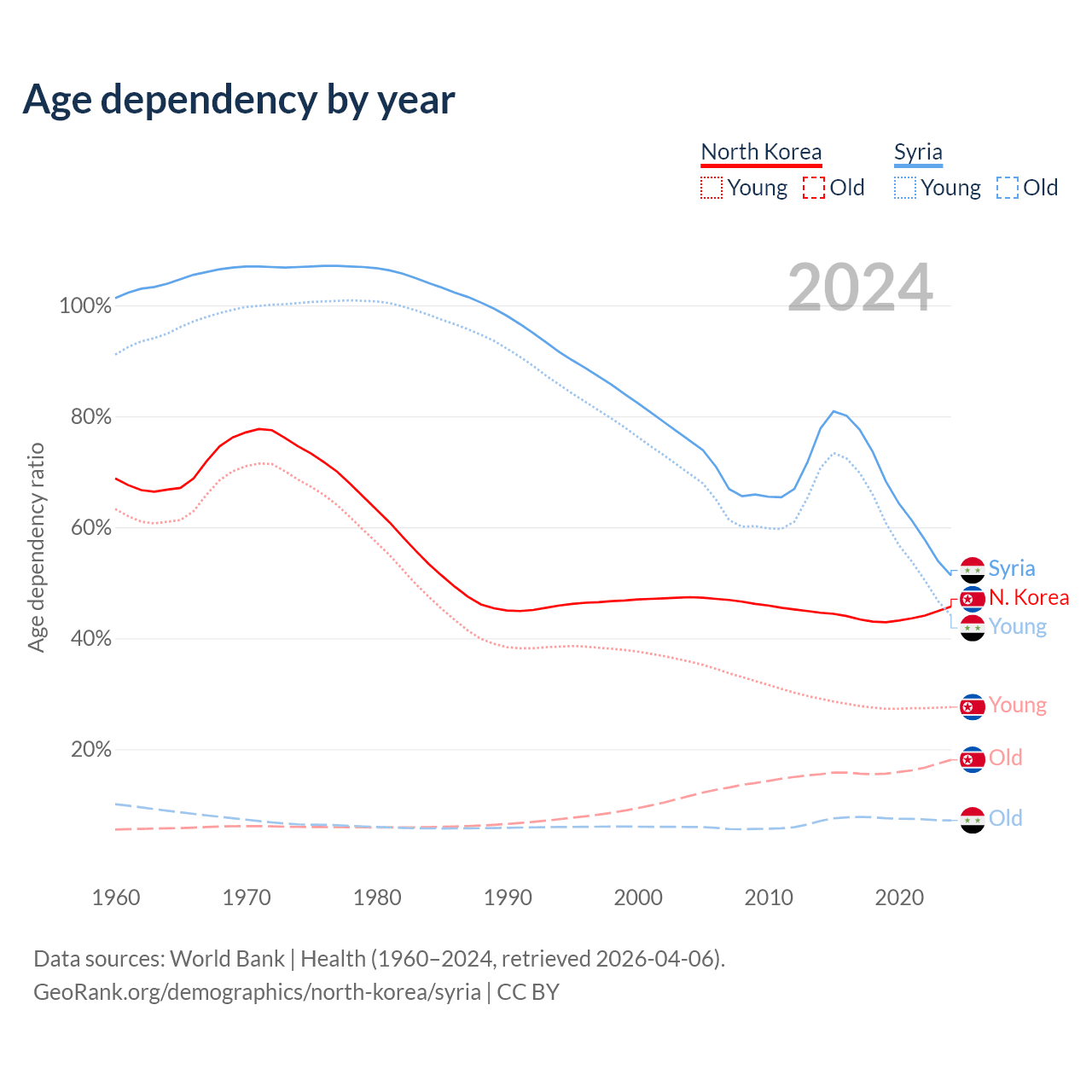 - North Korea is ranked 62/196 by median age (oldest to youngest) vs 138/196 for Syria.