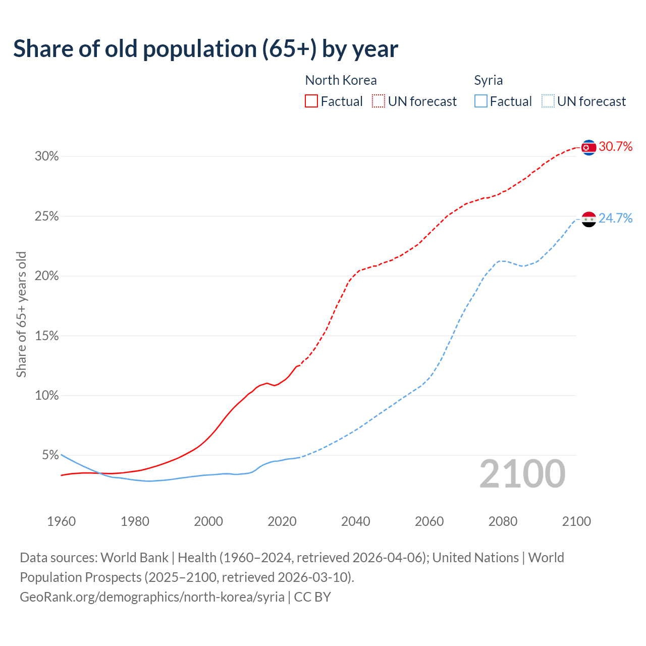 The share of older people aged 65 and over is 12.4% in North Korea and 4.74% in Syria. Life expectancy in North Korea compared to Syria .
