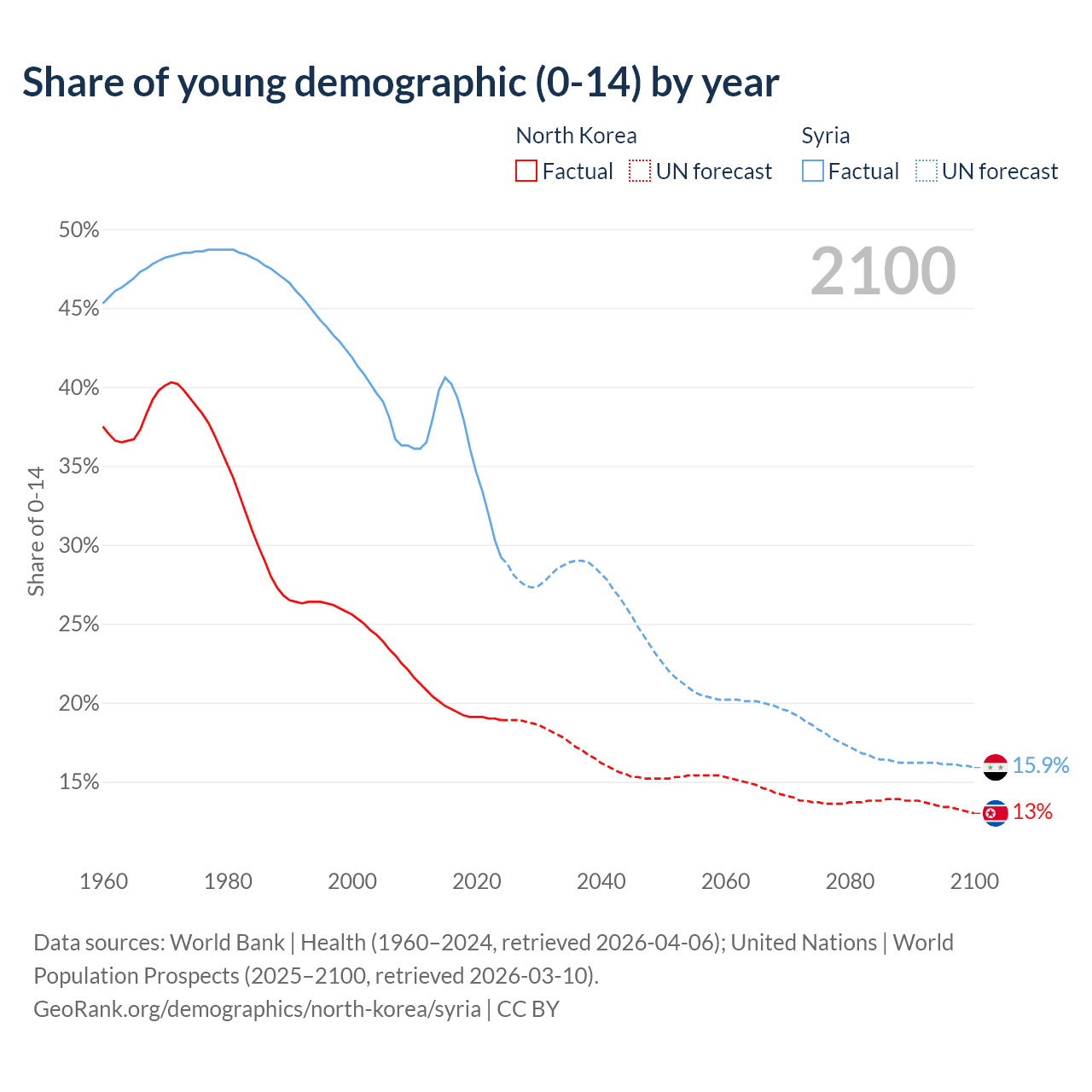 - The share of young demographic (0-15 years old) in North Korea is 18.9% vs 29.2% in Syria.