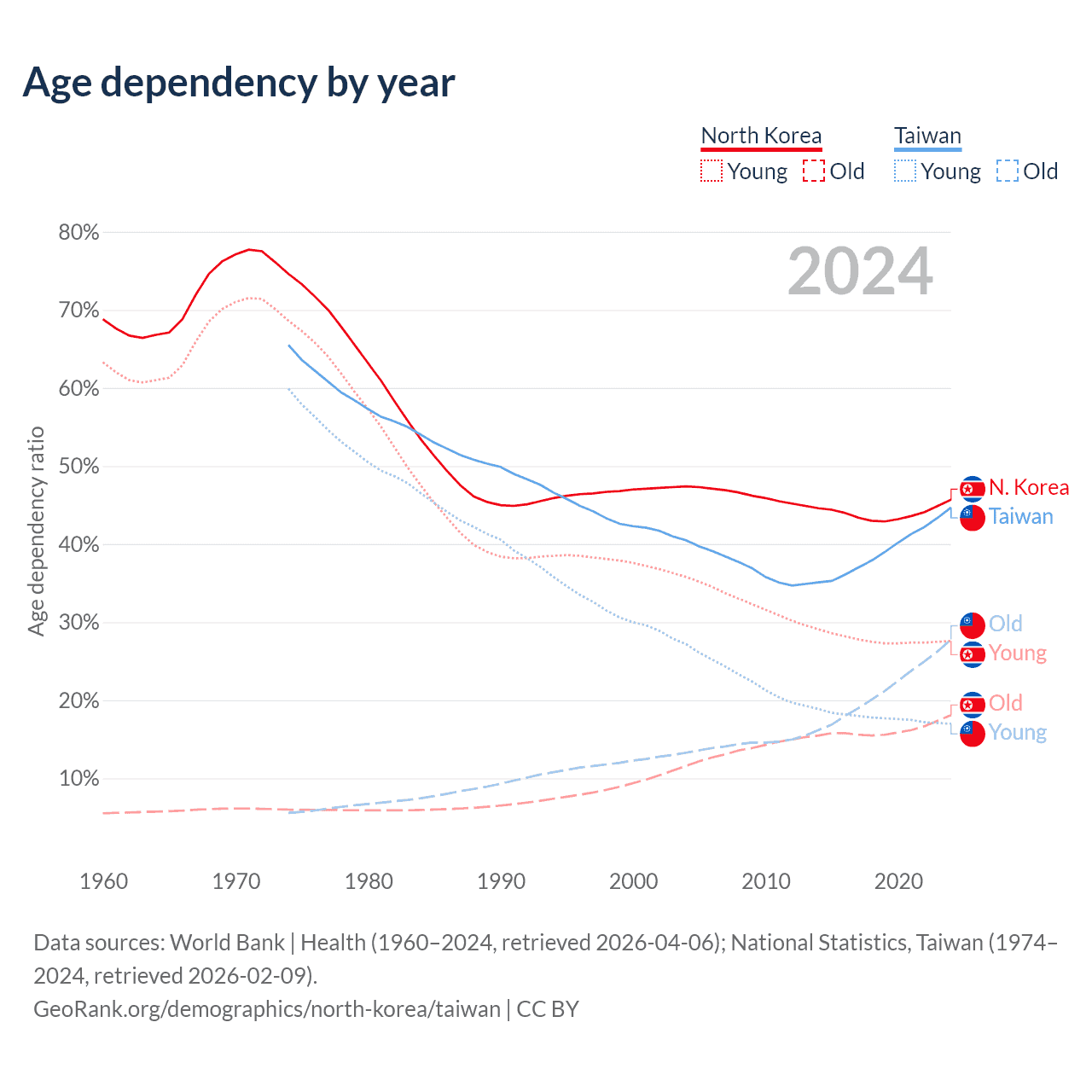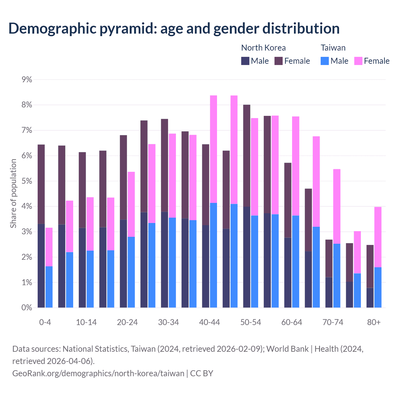- North Korea is ranked 62/196 by median age (oldest to youngest) vs 16/196 for Taiwan.