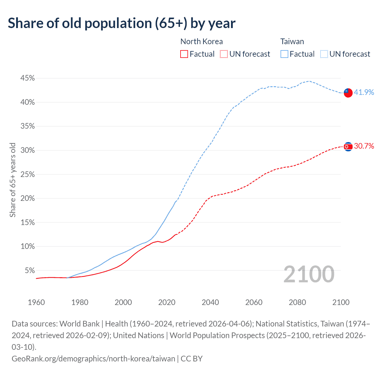 The share of older people aged 65 and over is 12.4% in North Korea and 19.2% in Taiwan. Life expectancy in North Korea compared to Taiwan .
