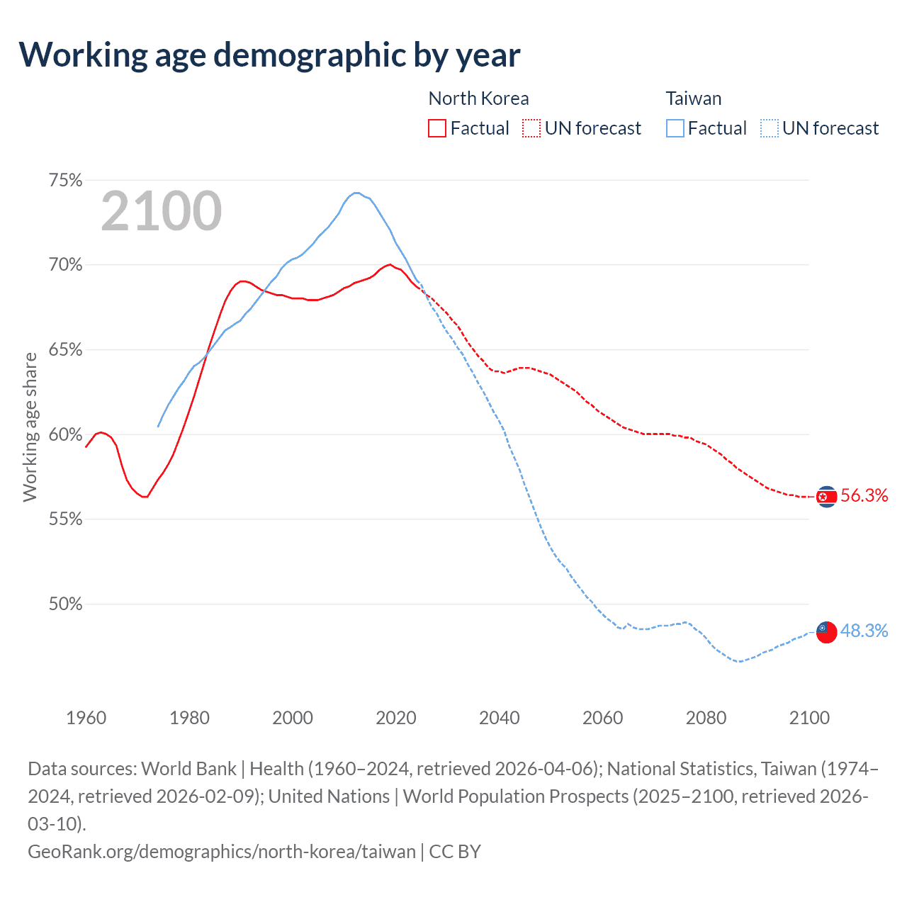 - North Korea has 18.3M working age adults (aged 15-64) vs 16.1M in Taiwan.
