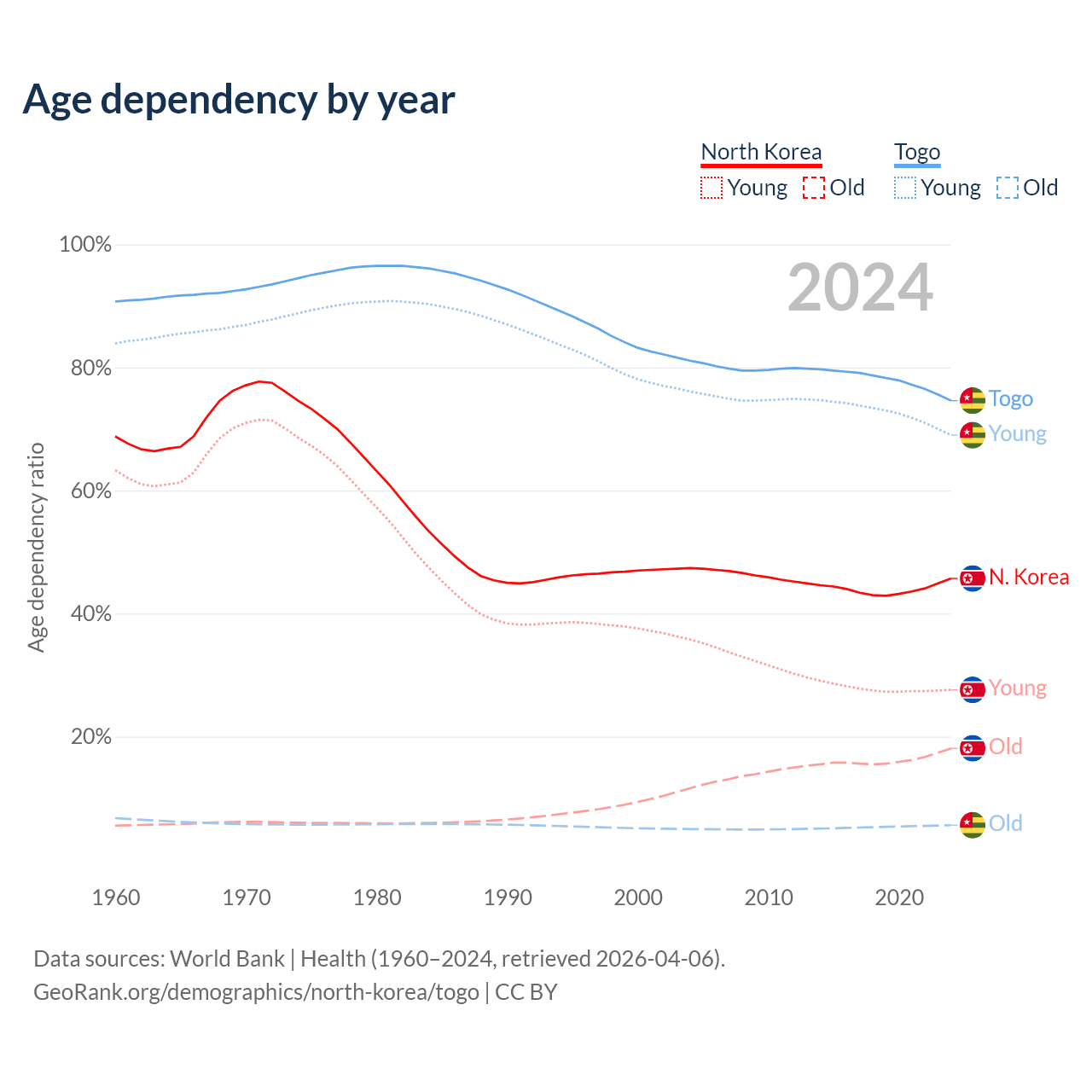 - North Korea is ranked 62/196 by median age (oldest to youngest) vs 166/196 for Togo.