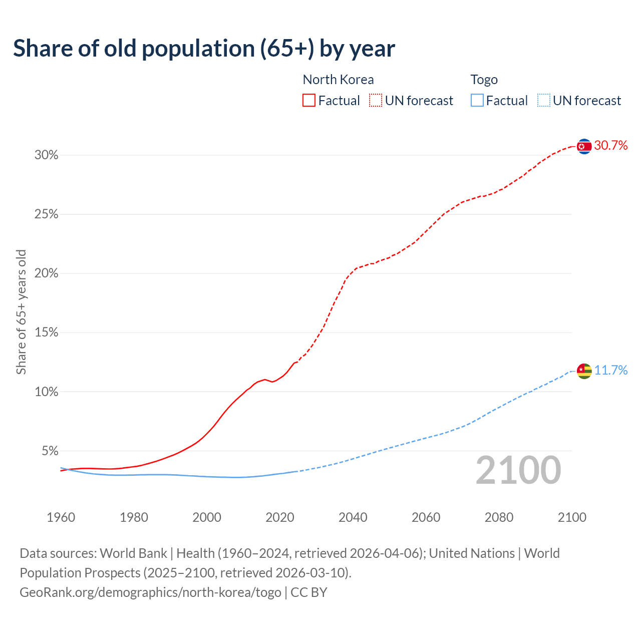 The share of older people aged 65 and over is 12.4% in North Korea and 3.21% in Togo. Life expectancy in North Korea compared to Togo .