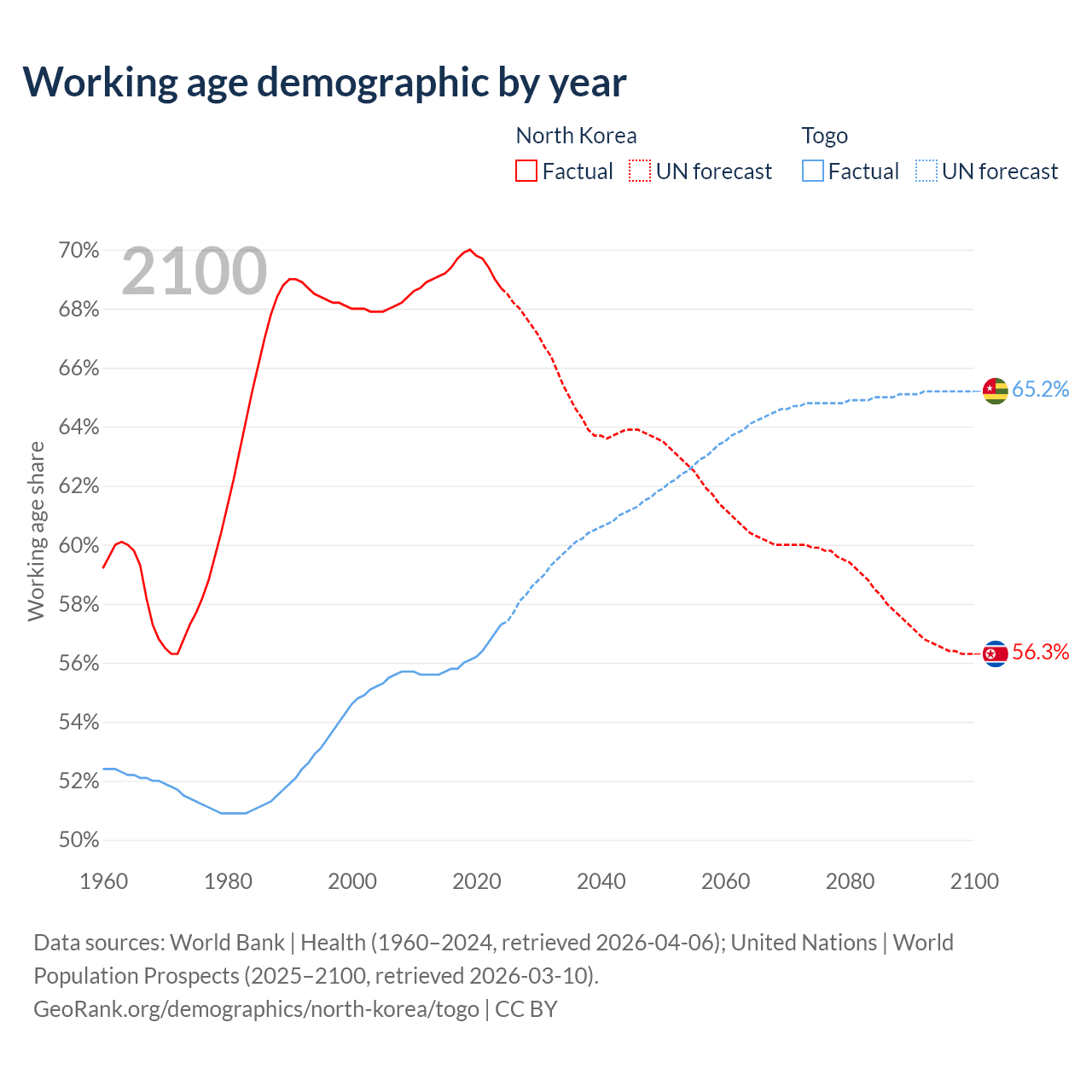 - North Korea has 18.3M working age adults (aged 15-64) vs 5.72M in Togo.