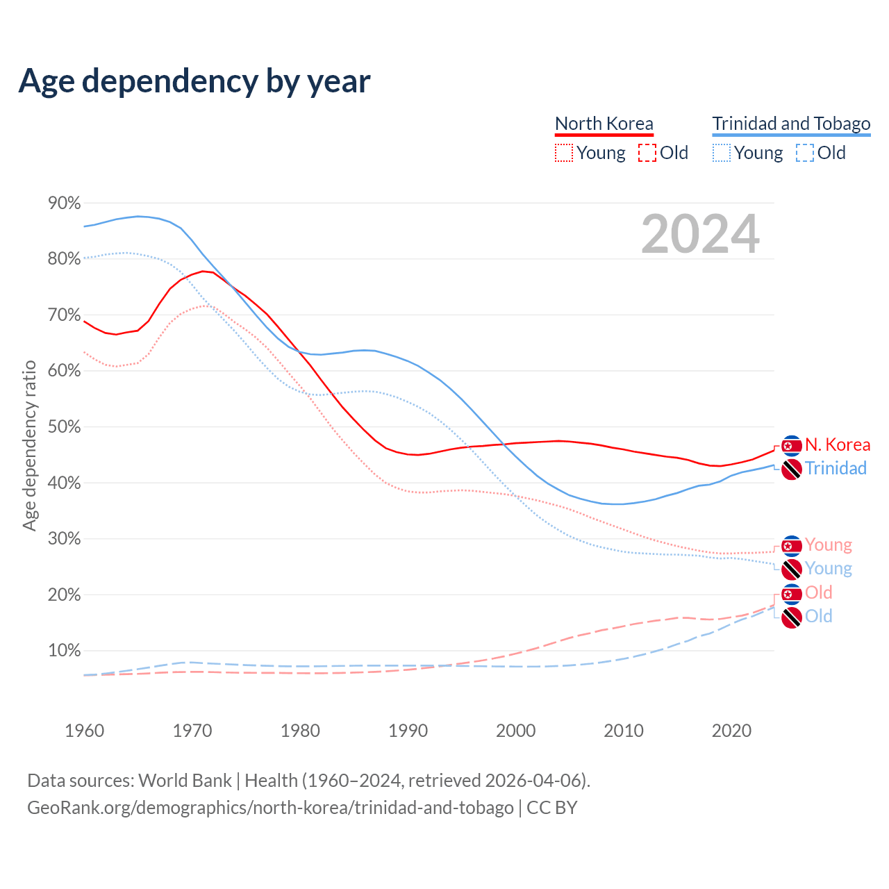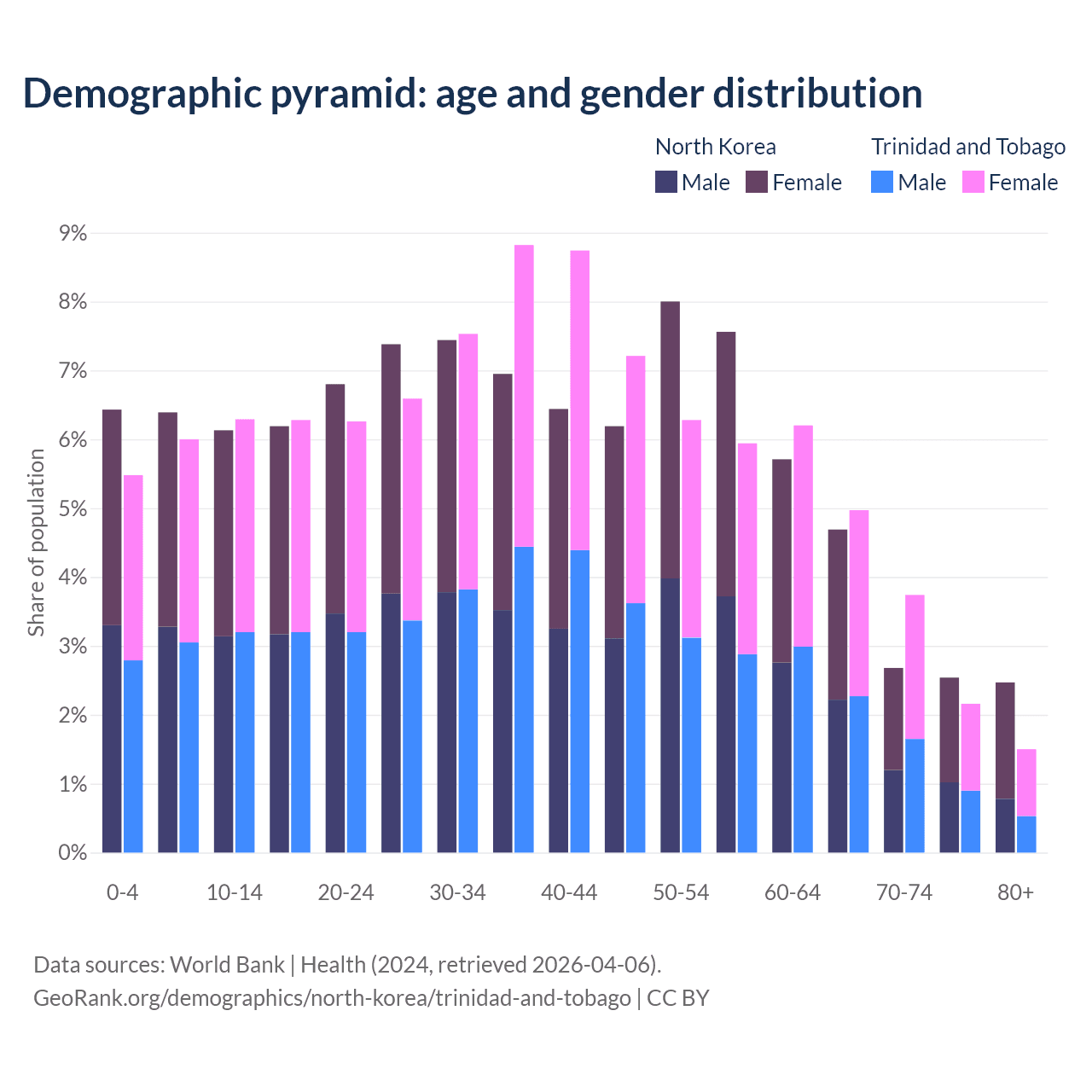 - The share of old-age demographic (65+) in North Korea is 12.4% vs 12.4% in Trinidad and Tobago.