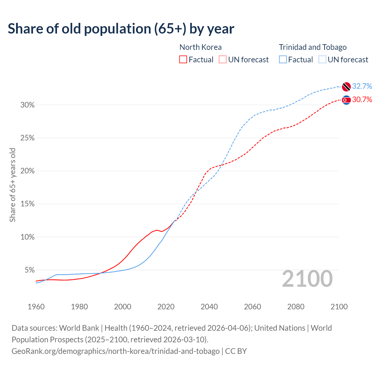 The share of older people aged 65 and over is 12.4% in North Korea and 12.4% in Trinidad and Tobago. Life expectancy in North Korea compared to Trinidad and Tobago .