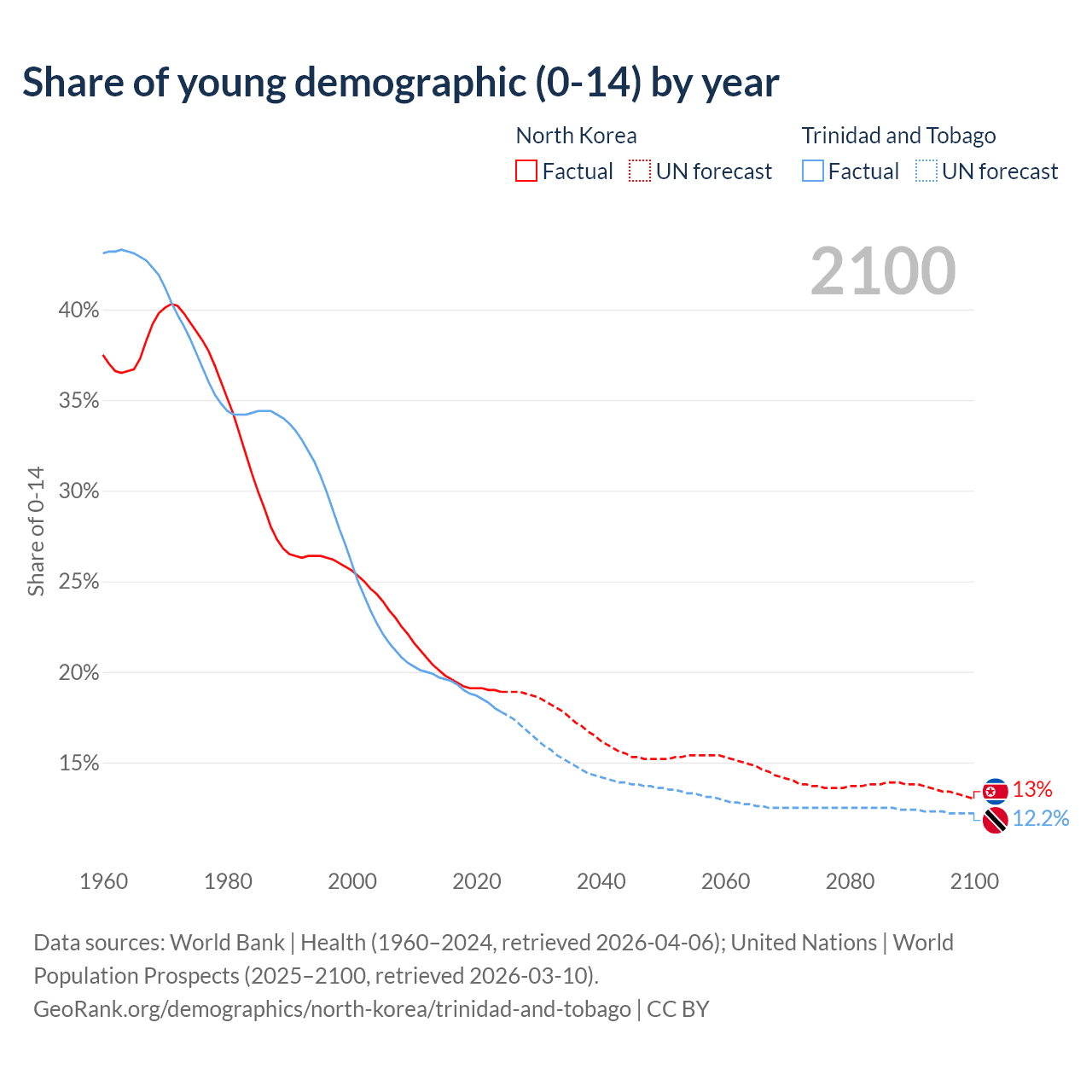 - The share of young demographic (0-15 years old) in North Korea is 18.9% vs 17.8% in Trinidad and Tobago.