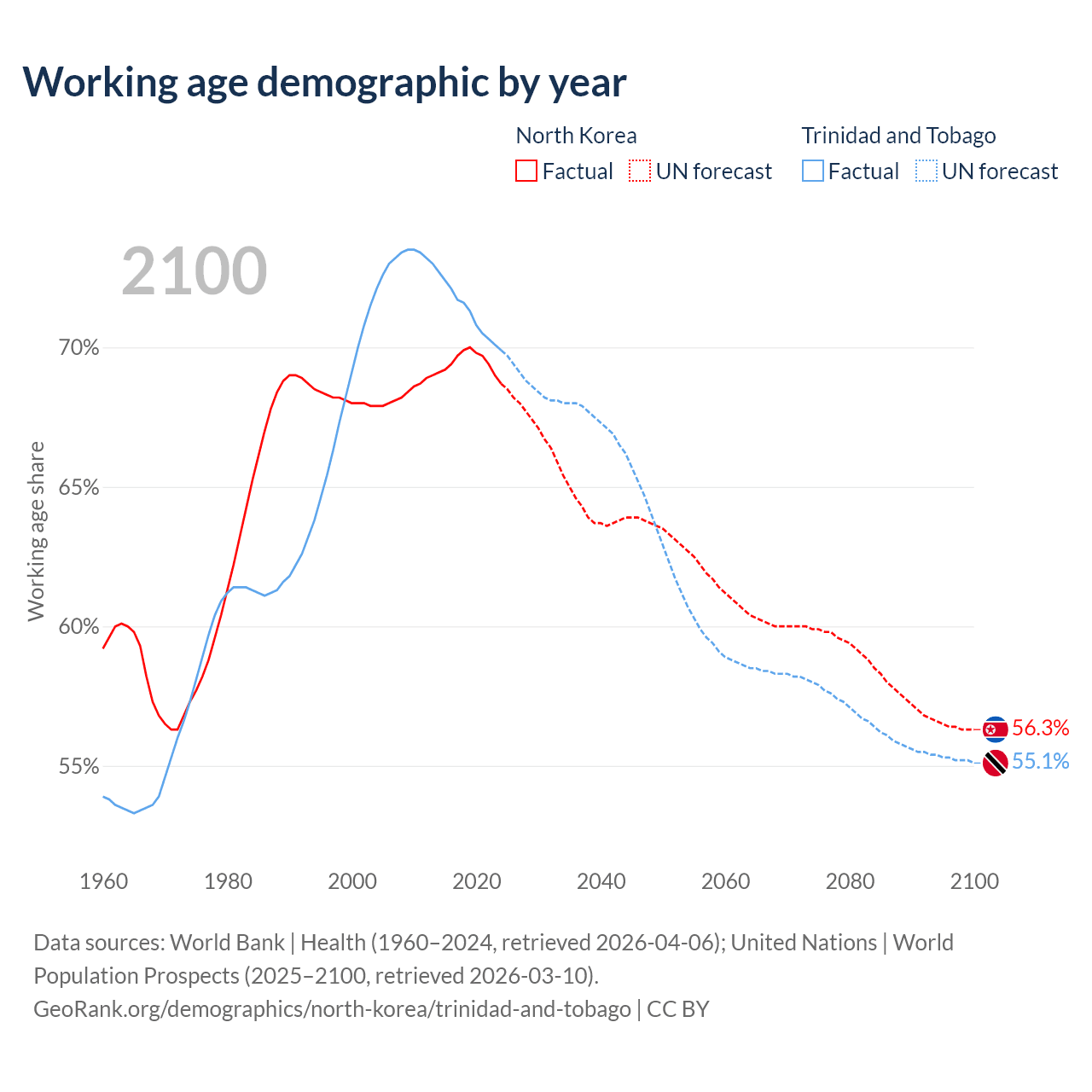 - North Korea has 18.3M working age adults (aged 15-64) vs 960K in Trinidad and Tobago.