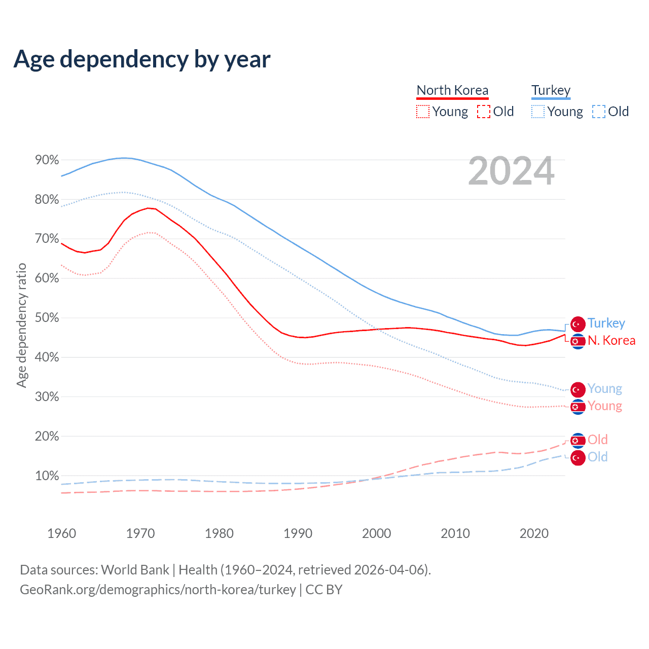- North Korea is ranked 62/196 by median age (oldest to youngest) vs 83/196 for Turkey.