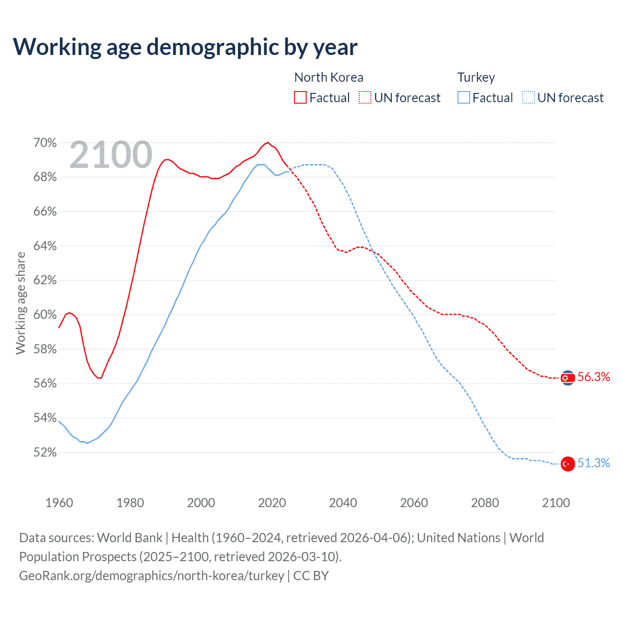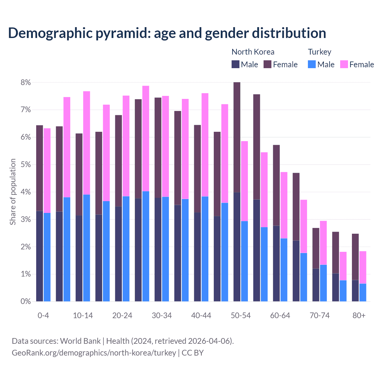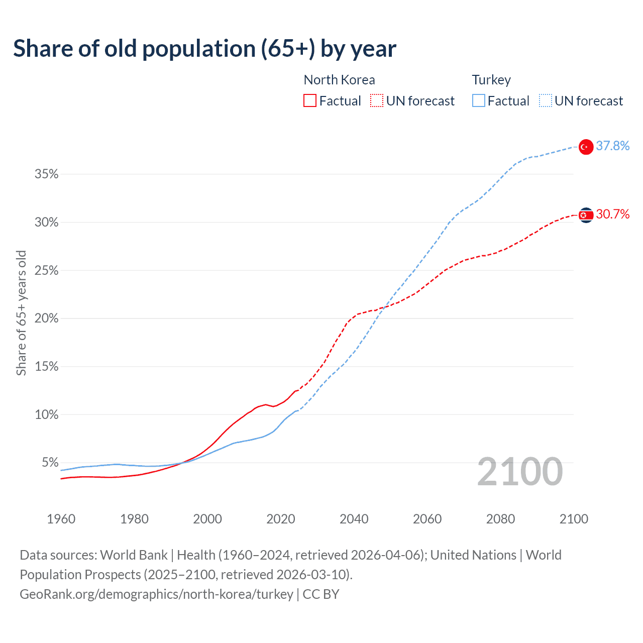 The share of older people aged 65 and over is 12.4% in North Korea and 10.3% in Turkey. Life expectancy in North Korea compared to Turkey .